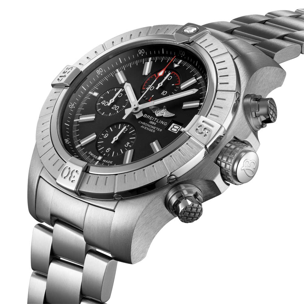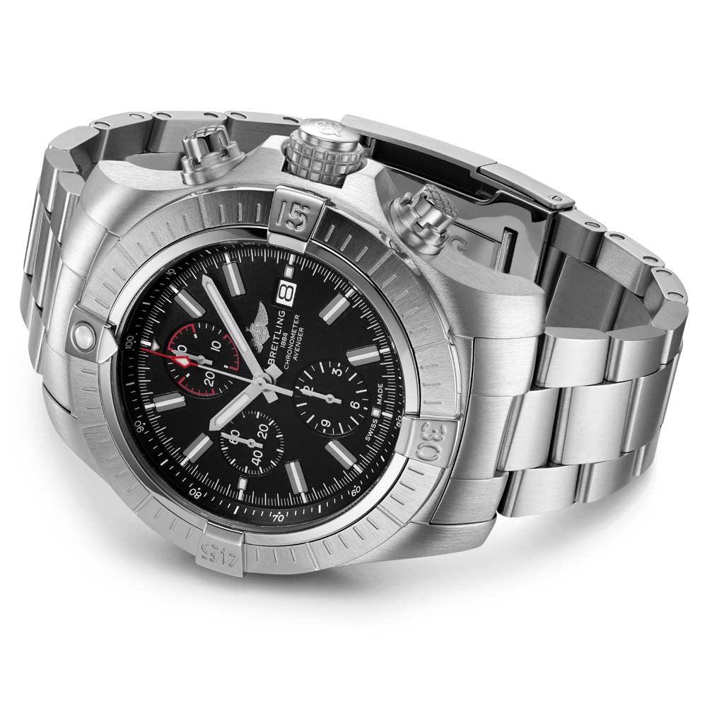 The Breitling Super Avenger Chronograph 48 exudes toughness and resilience. its 48mm stainless steel case designed to stand out. Its construction is shock resistant and its proportions provide extraordinary defense; the bezel. crown and pushers boast a grip-pattern that makes them easy to use even with gloves. Additionally. the Chronograph 48 comes with a black dial and the choice of a stainless-steel bracelet or a black military leather strap. both equipped with a stainless-steel pin buckle or folding clasp.