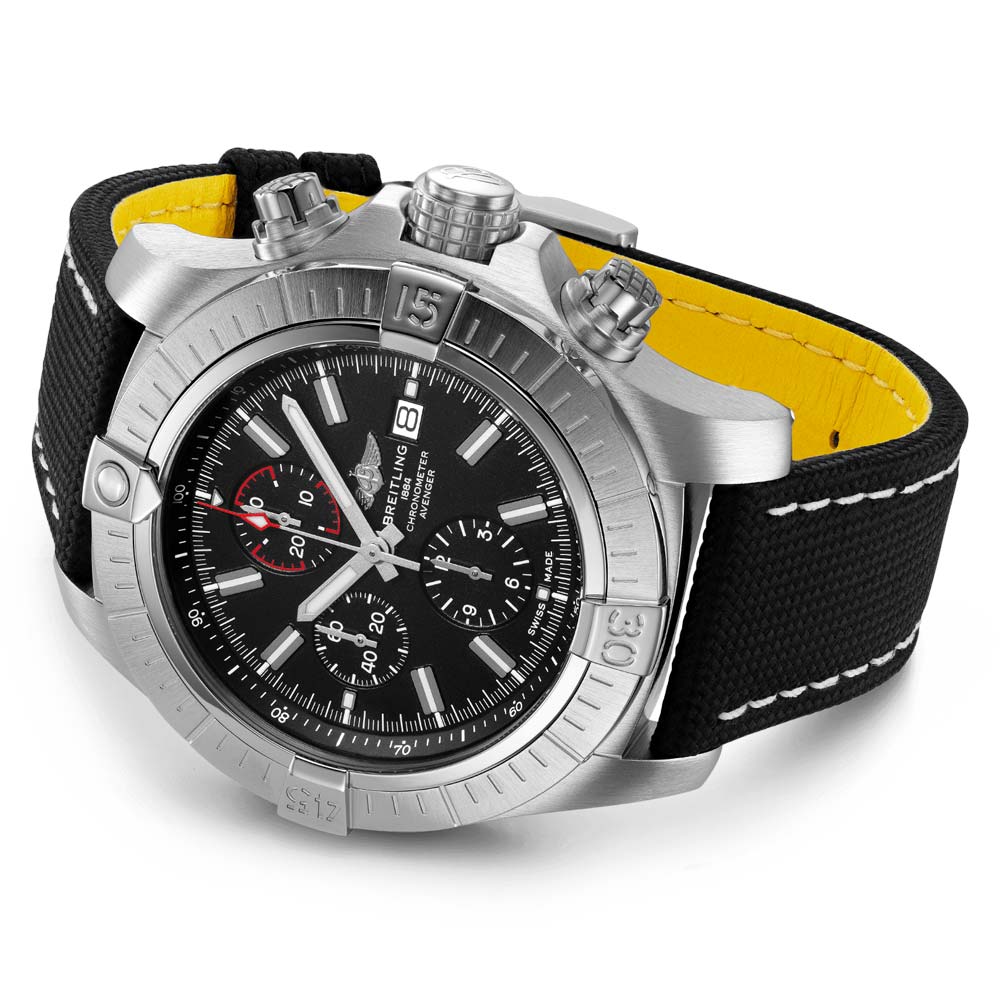 The Breitling Super Avenger Chronograph 48mm Black Dial Automatic Gents Watch A13375101B1X2 is designed to endure the toughest conditions. Its 48mm stainless steel case and black dial. featuring grip-patterns on the crown and chronograph pushers. provide unbeatable strength and stability. With an optional stainless-steel bracelet or black military leather strap and stainless-steel pin buckle or folding clasp. this timepiece offers unbeatable reliability and safety. perfect for adventurers.