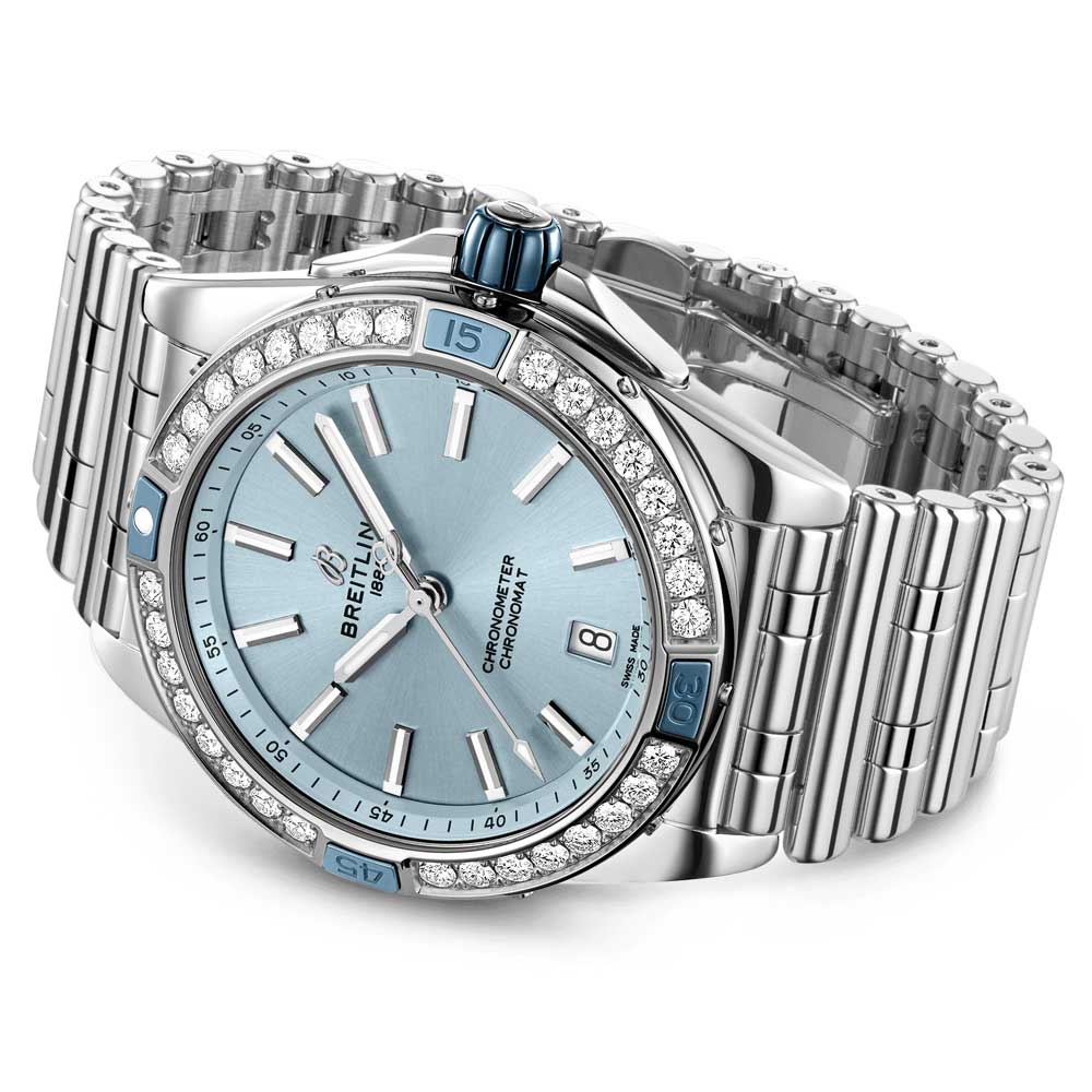The Super Chronomat Automatic 38 is designed to stand out. with its ceramic rider tabs and crown vividly marking it from the other Chronomat watches. The rubber rouleaux bracelet is exclusive to this powerful piece. complemented by its 18ct red gold or stainless-steel bezel lined with oversized laboratory-grown diamonds. Its dials come in a variety of colours that offer an eye-catching look. with your choice of bracelet or strap for a personalized touch.