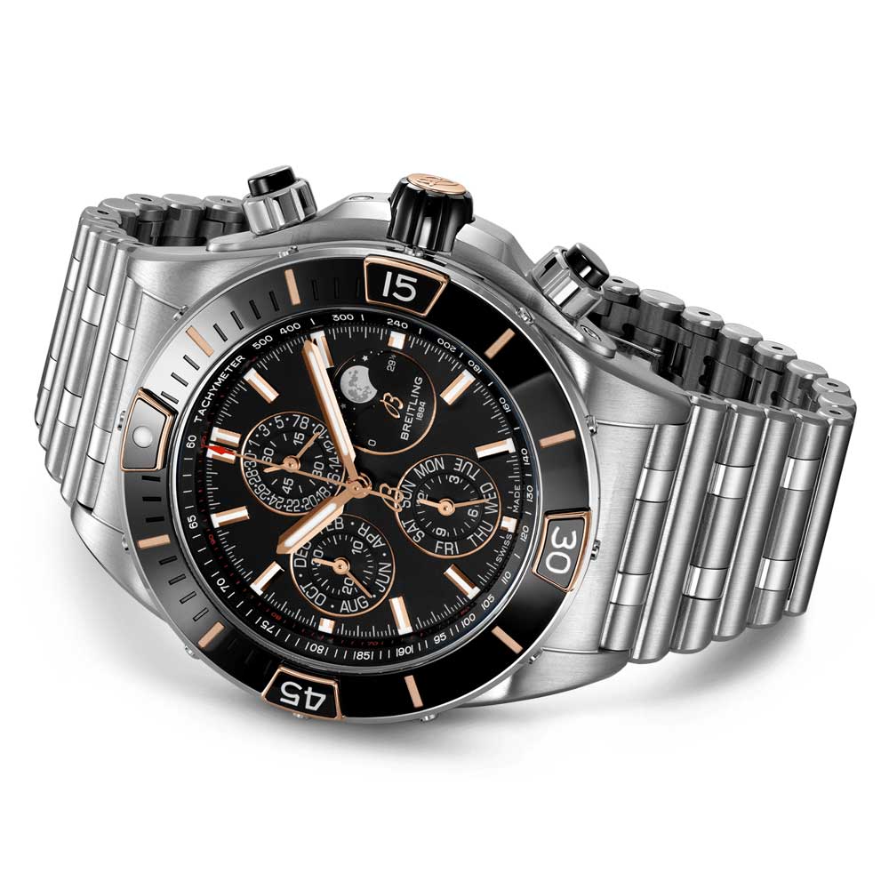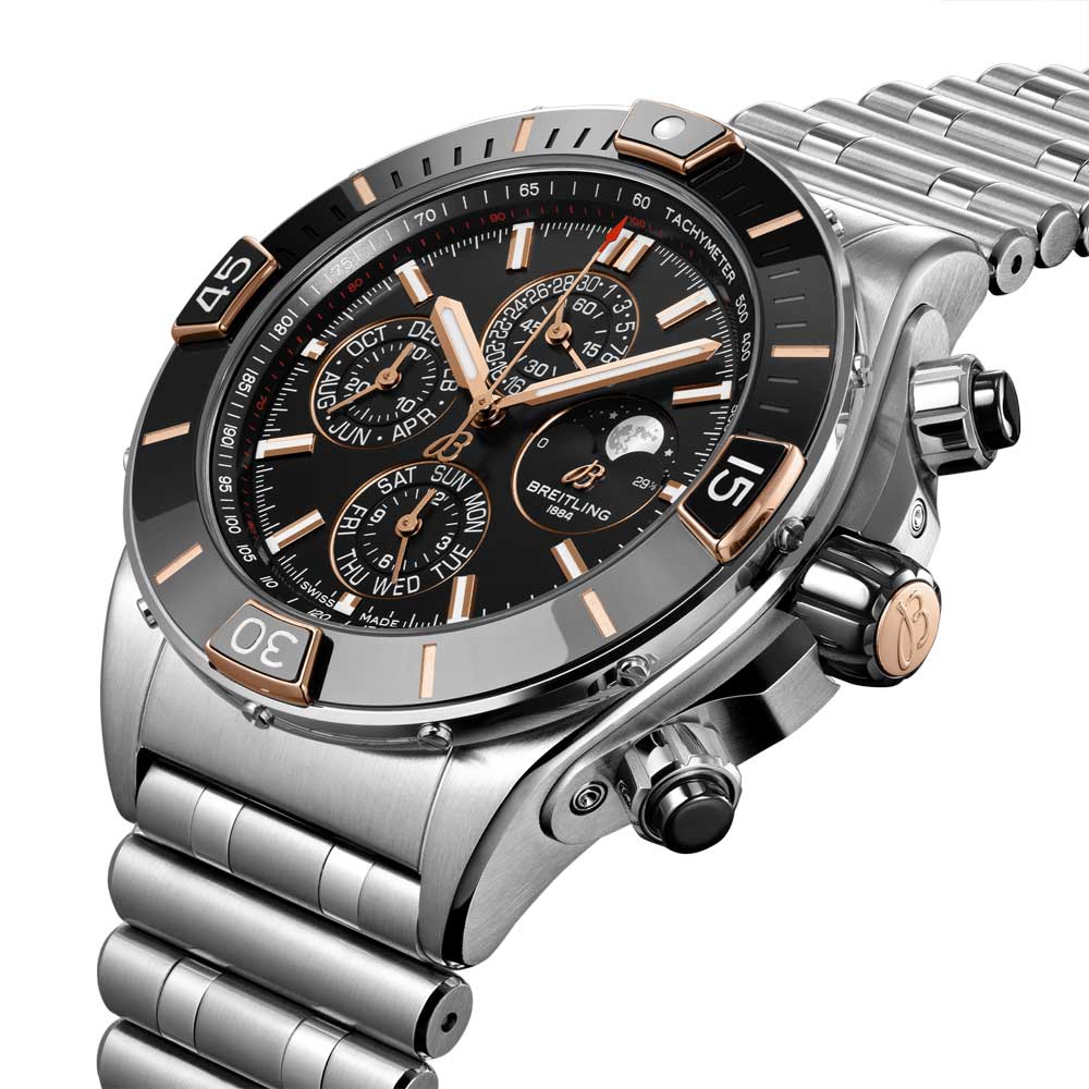 Boasting a 4-year calendar. the Breitling Super Chronomat is a powerful watch suited for any activity. The design is inspired by the Chronomat created by the brand in the 80s for aerobatic squads. Showcasing several ceramic inserts. as well as a Rouleaux-style rubber strap. the Super Chronomat is both stylish and functional. Available in stainless steel or 18ct red gold. the Super Chronomat comes with a Rouleaux bracelet or a rubber Rouleaux-inspired strap and a folding clasp. Hosting the COSC-certified Breitling Calibre 19 with semi-perpetual calendar. manual adjustment is only required every leap year or 1.461 days.