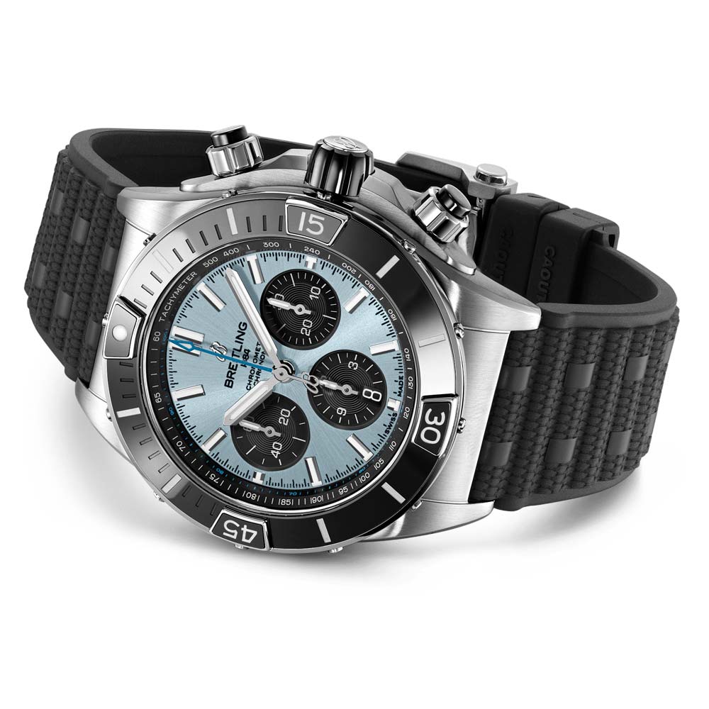 The Breitling Super Chronomat is a luxurious and powerful watch inspired by the renowned Frecce Tricolori aerobatic squadron. With its COSC-certified Breitling Manufacture Calibre 01. this model is available in stainless steel. 18ct red gold. and platinum. sporting ceramic inserts on its bezel. chronograph pushers. and crown. The timepiece is detailed with a Rouleaux-style bracelet or rubber strap. both paired with a folding clasp.