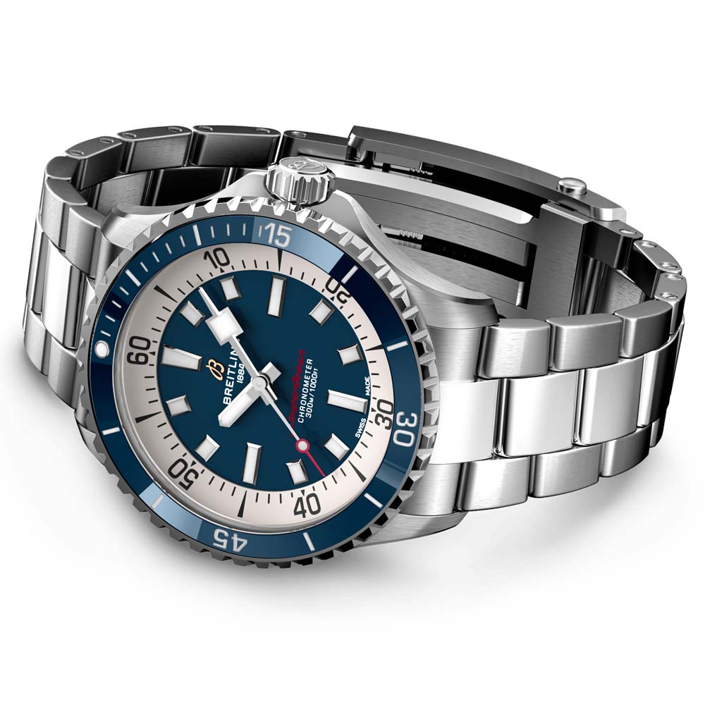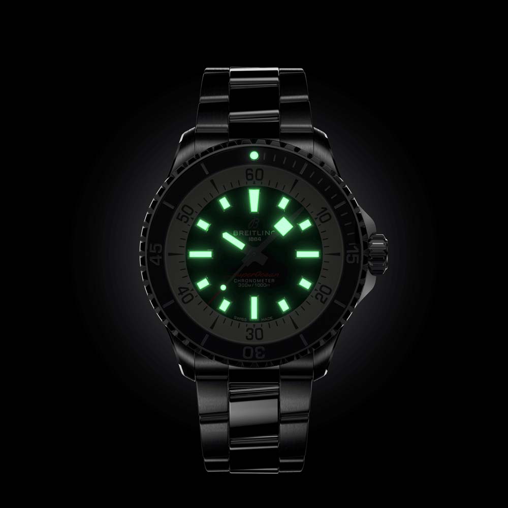 The Superocean is the perfect combination of classic performance and stylish design. In the 1960s. Breitling released the Slow Motion dive watch. focused on maximum readability with features such as luminescent indexes and squared-off hands. The Superocean captures that iconic look while introducing modern touches such as a ceramic-inlayed bezel and bright dials. Water resistance to 300 m (1000 ft). shock-proof. sand-proof. and saltwater-resistant. it is a versatile choice for any water-based activity.
