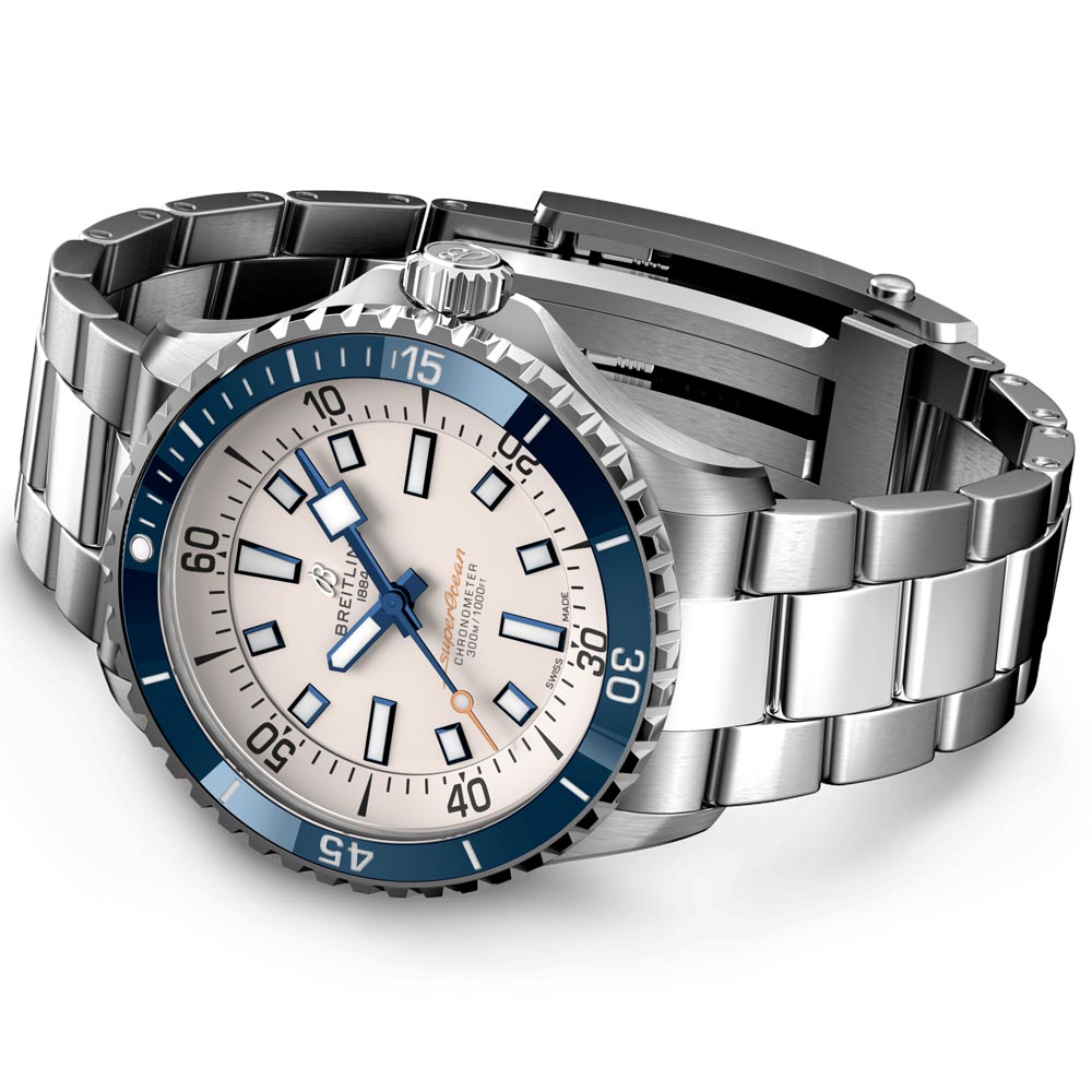 The practicality of the Superocean is undeniable. but its true appeal lies in its classic design. Referencing the classic Slow Motion. this model features contemporary elements such as a ceramic-inlayed bezel and vibrant dials. Additionally. the broad hands and indexes coated in Super-LumiNova® ensure optimal underwater readability. The watch is also certified for a water-resistance of up to 300 m (1000 ft) and can further withstand shocks. sand. and saltwater.