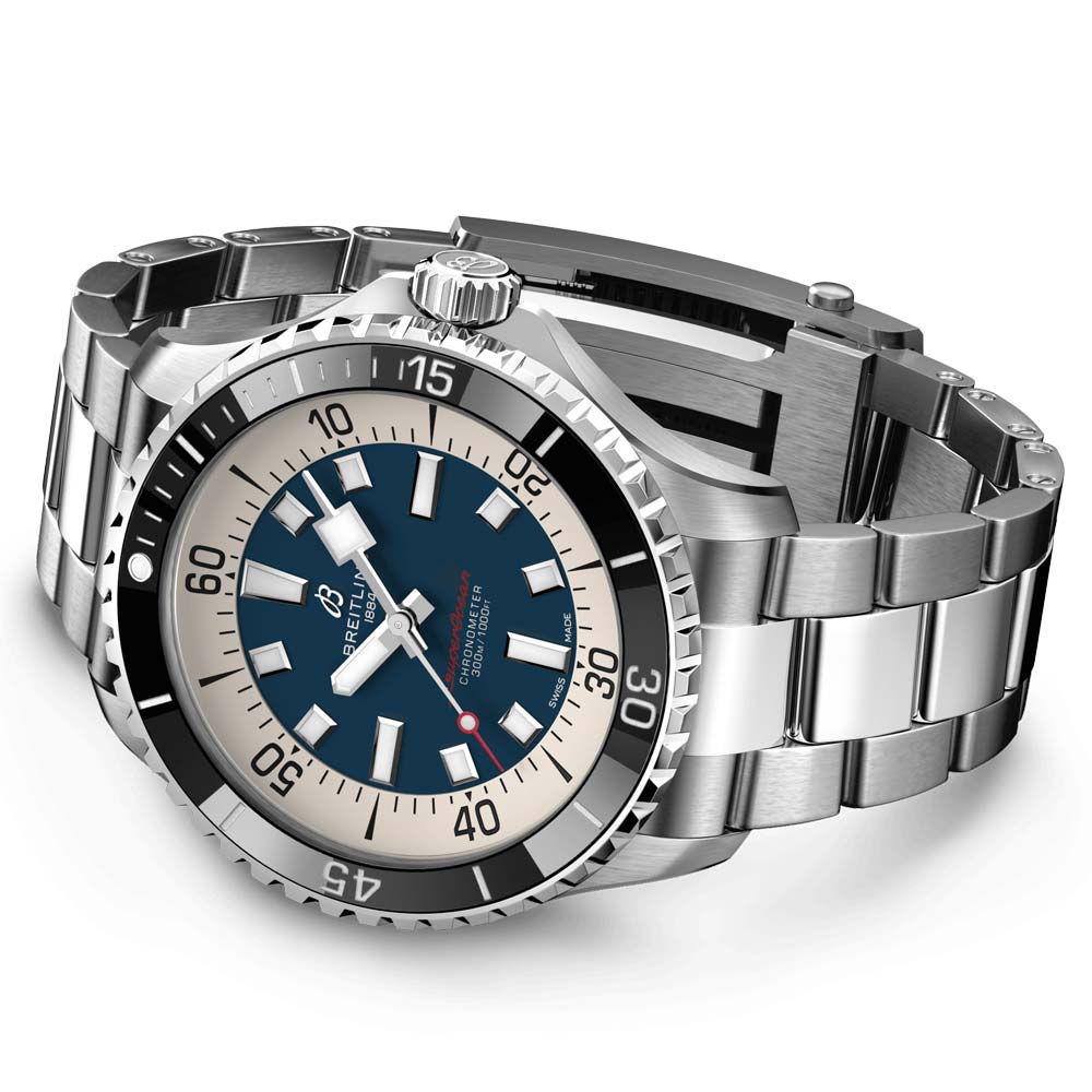 Designed to help divers achieve perfectly timed dives. the 1960s-inspired Breitling Superocean brings together performance and style. Featuring a pared-down profile. the Superocean comes complete with clean lines. luminescent indexes. squared-off hands and a high-contrast dial ring for maximum legibility. With a ceramic bezel and bright colored dial. the watch also has broad hands and indexes with Super-LumiNova®. for easy readability even in underwater conditions. Resistant to shocks. sand. salt water. and up to 300 m (1000 ft) of water. the Breitling Superocean is a reliable and eye-catching companion for any water-based adventure.