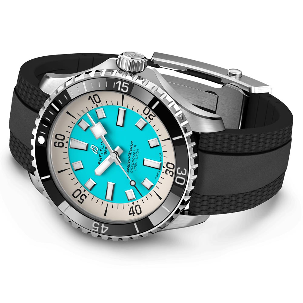 This Breitling Superocean watch features two adjustable straps (rubber and metal bracelet) with a folding clasp capable of up to 15mm of micro-adjustment. Its scratchproof ceramic bezel is both long-lasting and stylish. while being unidirectional on smaller sizes and featuring a patented locking system on the 46 mm. Whether diving. surfboarding. swimming. or simply enjoying a day at the beach. this classic yet modern timepiece has you covered.