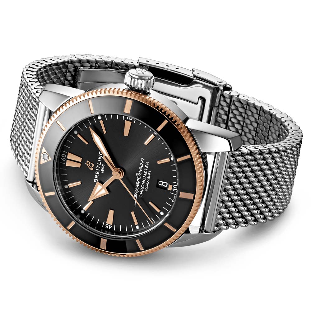 The crowning touch: a mesh bracelet or “mesh-style�?rubber strap with a folding buckle. To top it off. the Superocean Heritage is powered by the Breitling Manufacture Calibre B20. a COSC-certified chronometer.