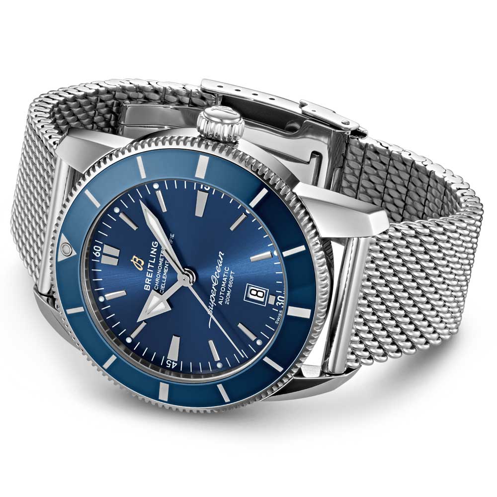 The Superocean Heritage B20 combines vintage design cues with a contemporary touch. Boasting a sporty and refined aesthetic. it is a stunning tribute to style and performance at sea. This diver's watch features the classic triangular-shaped hands and a unidirectional bezel with a gleaming ceramic ring. Available in stainless steel and 18ct red gold editions. it stands out with an array of dial colors and a variety of sizes. It is paired with either a mesh bracelet or a “mesh-styled�?rubber strap complemented by a folding buckle. Powered by Breitling's in-house Manufacture Calibre B20. COSC-certified chronometer based on the Tudor Calibre MT5612.
