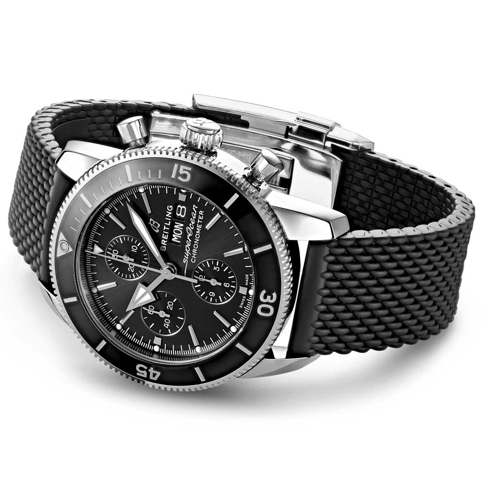 The Superocean Heritage Chronograph 44 is Breitling's modern update to the iconic 1950s design. Its sporty yet elegant style is perfect for a day at sea. The watch features classic triangular hands and a unidirectional bezel with ceramic ring. Choose between a mesh bracelet or "mesh-styled" rubber strap with folding buckle. The reliable Breitling Calibre 13. a certified chronometer. powers the watch. Available in stainless steel and 18ct red gold with black or blue dials.