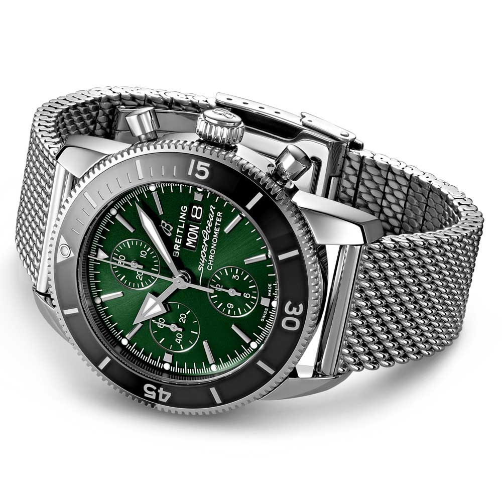 The Superocean Heritage Chronograph 44 is available in stainless steel and 18ct red gold. boasting a collection of colorful dials. Sporting a mesh bracelet or a "mesh-styled" rubber strap with a folding buckle. this watch is powered by a COSC-certified chronometer. Breitling Calibre 13.