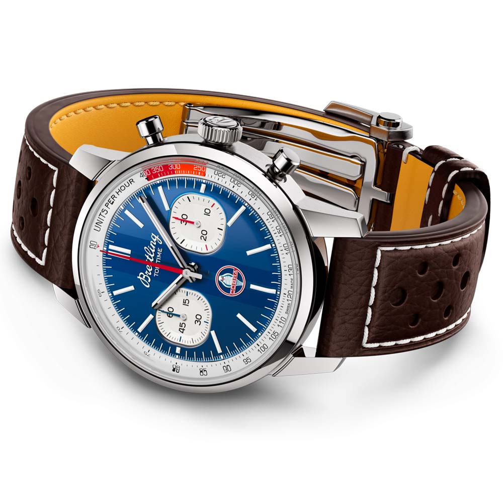 In the '60s. Carrol Shelby created a car blending a small. lightweight British frame and powerful American engine. Upon its debut in '62. the Cobra delighted sports fans and took the racing circuit by storm. Its blistering speed and beloved status amongst collectors continues today. The Top Time B01 Shelby Cobra proudly displays its classic namesake's symbol and colour scheme. plus a perforated leather racing strap. a tachymeter for speed measurement. and unique squircle subdials inspired by vintage dash gauges. It features the esteemed Breitling Manufacture Calibre 01 too.