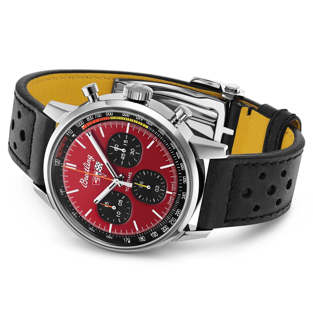 Breitling's chronograph offers a motorsport-inspired twist. The Breitling Top Time Classic Cars Squad pays tribute to classic sports cars from the 1960s with three racing chronographs. honoring the Chevrolet Corvette. Ford Mustang and Shelby Cobra - all designs modeled from the original 1960s Breitling Top Time watches.