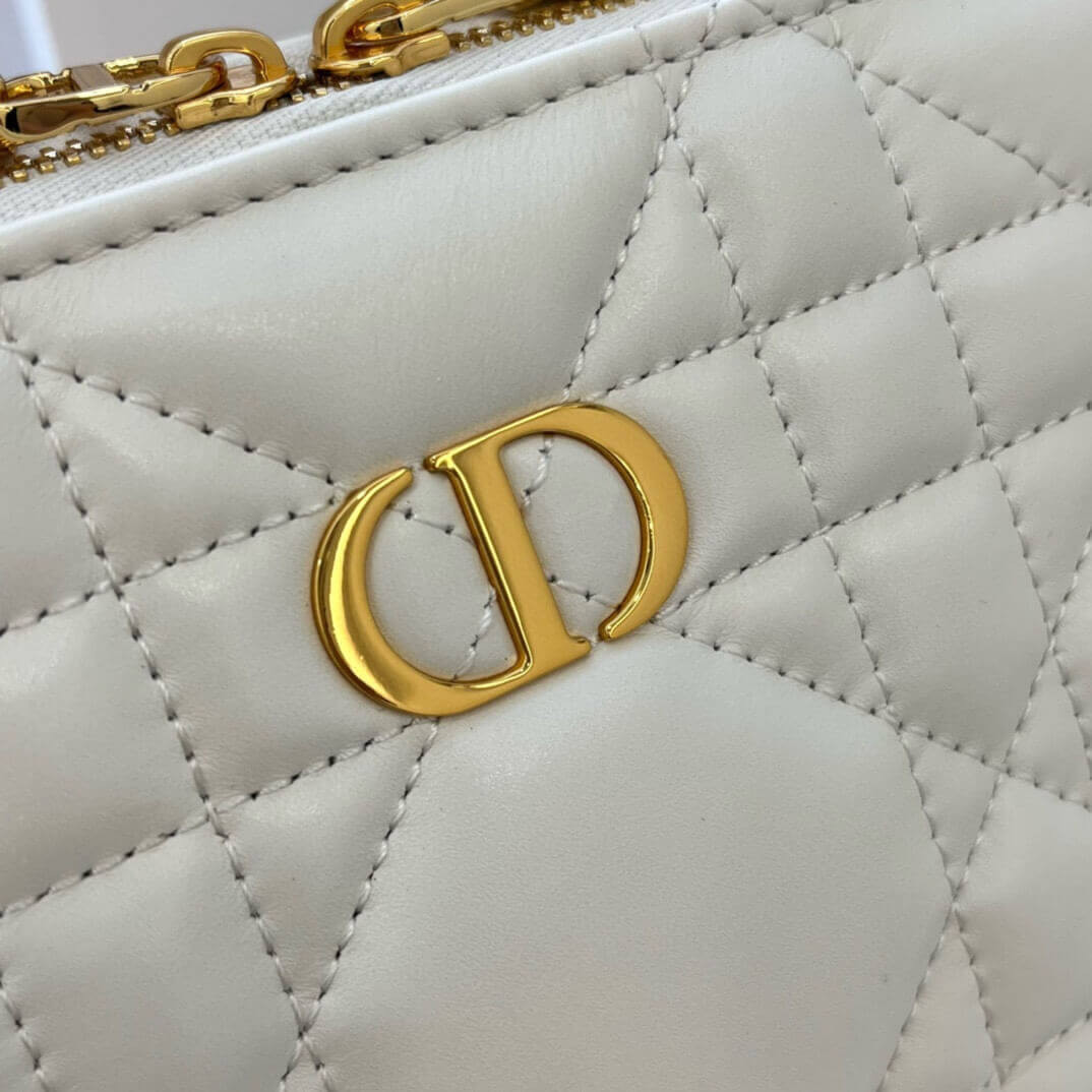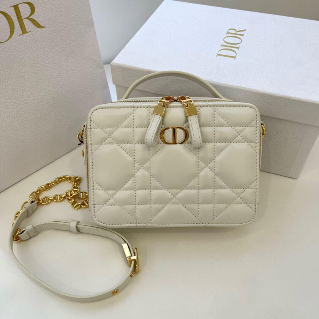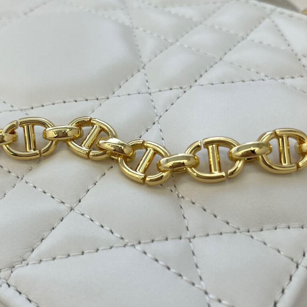 New this season, Maria Grazia Chiuri's Dior Caro box bag with chain is a modern creation. Crafted in latte calfskin, it stands out with a unique Macrocannage quilted effect and a spacious compartment, including three card slots, to accommodate all the daily essentials. The removable chain strap features a leather insert for comfortable and adjustable wear, either over the shoulder or crossbody, while the handle allows it to be carried by hand.