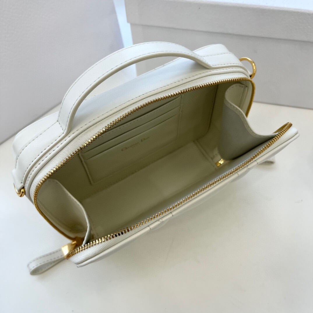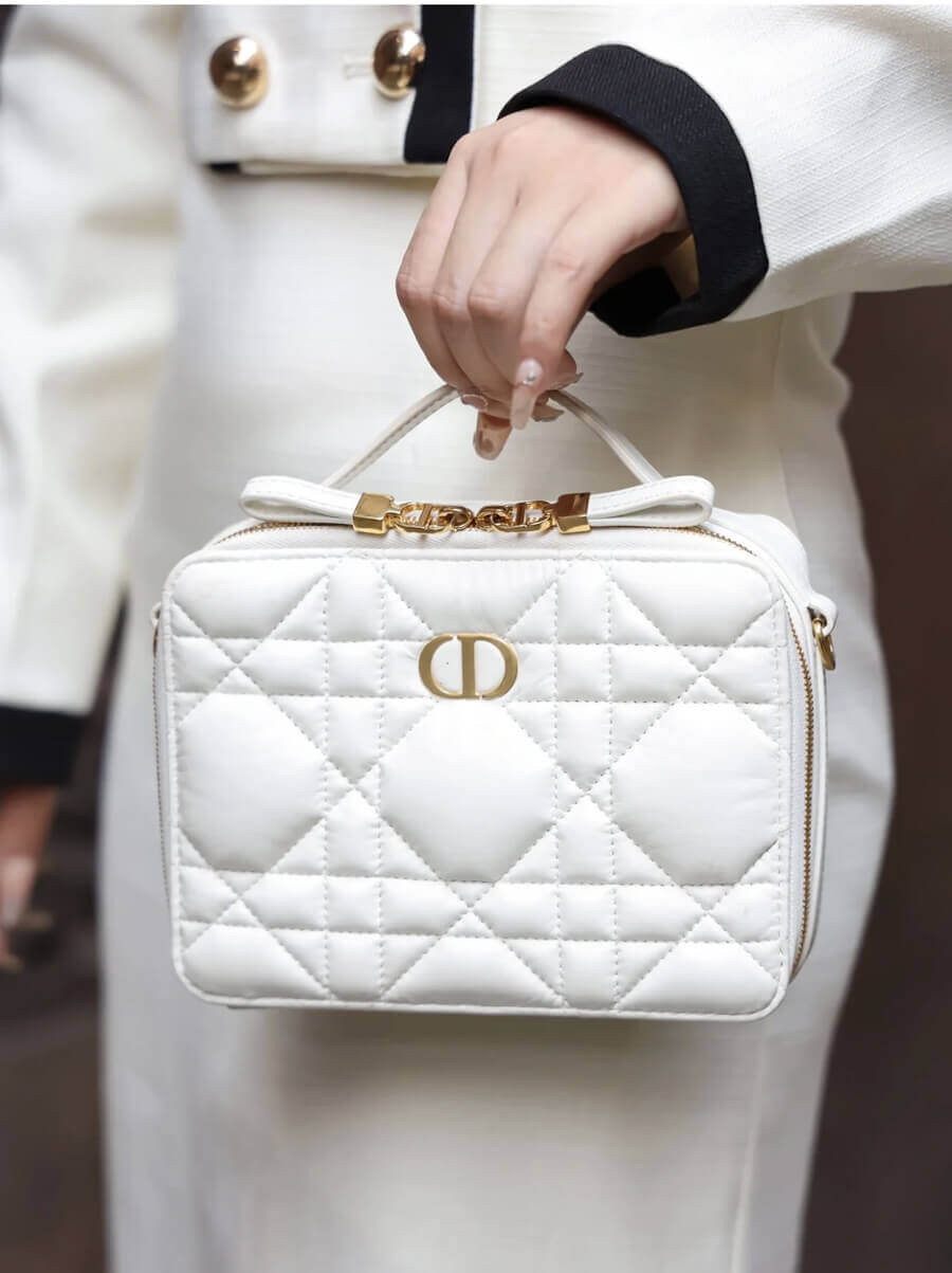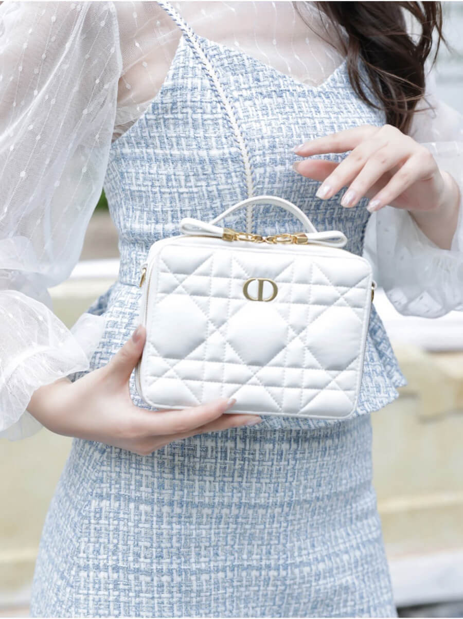 New this season, Maria Grazia Chiuri's Dior Caro box bag with chain is a modern creation. Crafted in latte calfskin, it stands out with a unique Macrocannage quilted effect and a spacious compartment, including three card slots, to accommodate all the daily essentials. The removable chain strap features a leather insert for comfortable and adjustable wear, either over the shoulder or crossbody, while the handle allows it to be carried by hand.