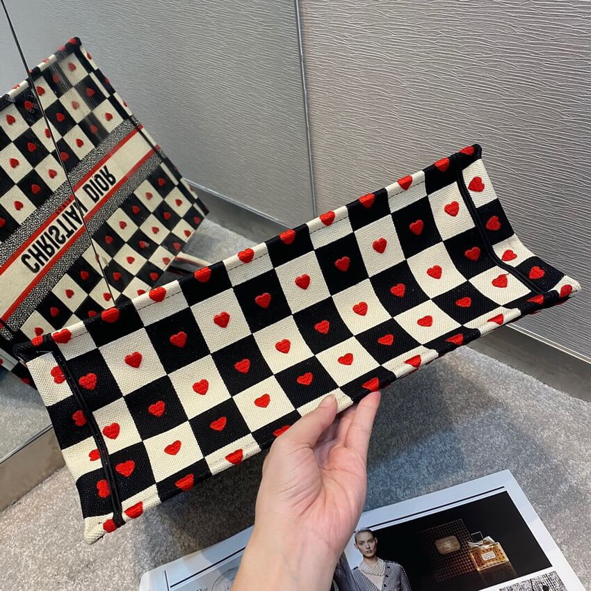 The Dior Book Tote, part of the Dioramour capsule, is an original creation introduced by Dior's Creative Director, Maria Grazia Chiuri, and has become a staple of the Dior aesthetic. The design is part of the Dioramour capsule and is fully embroidered with the black, white and red D-Chess Heart motif, further adorned with the 'CHRISTIAN DIOR' signature on the front. The small tote exemplifies the House's signature savoir-faire and may be carried by hand or worn over the shoulder.