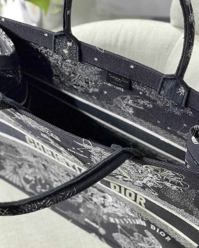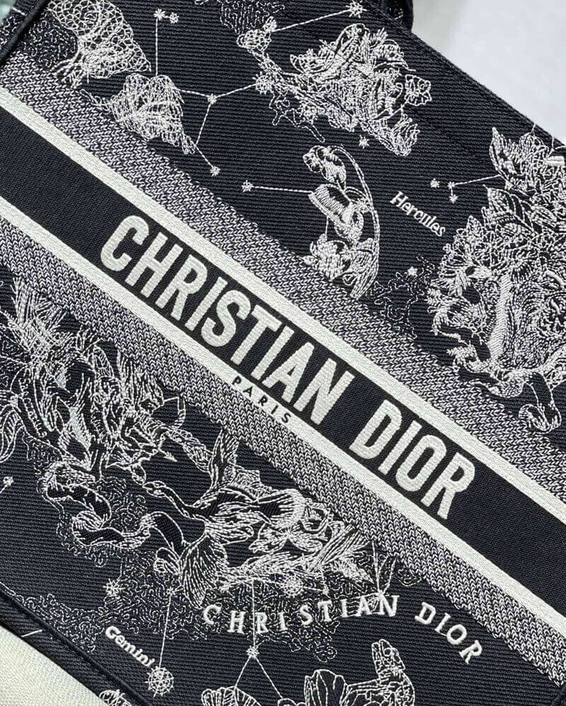 Introduced by Maria Grazia Chiuri, Creative Director of Christian Dior, the Dior Book Tote has become a staple of the Dior aesthetic. Designed to hold all the daily essentials, the blue style is fully embroidered with a Toile de Jouy Zodiac motif, a variation of the House's hallmark pattern that honors Mr. Dior's passion for astrology. Adorned with the 'CHRISTIAN DIOR PARIS' signature on the front, the large tote exemplifies the House's signature savoir-faire and may be carried by hand or worn over the shoulder.