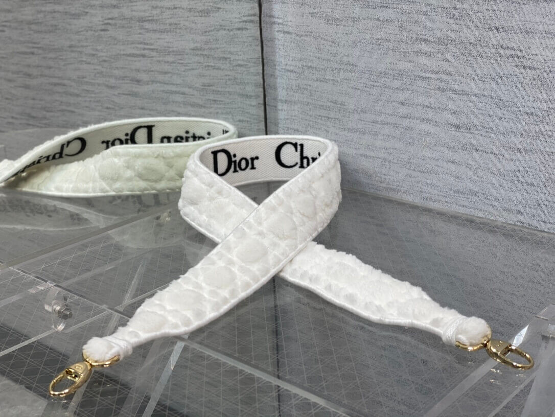 The Lady D-Lite bag combines classic elegance with House modernity. The latte shearling style showcases the Cannage motif. A 'CHRISTIAN DIOR PARIS' signature adorns the front, while 'D.I.O.R.' charms in pale gold-finish metal further enhance and highlight the silhouette. Featuring a wide, removable and reversible embroidered shoulder strap, the medium Lady D-Lite bag can be carried by hand or worn crossbody.