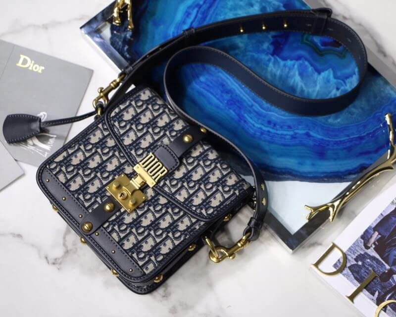 This flap bag is finely crafted of navy on beige Dior monogram canvas. The bag features navy cowhide leather trim, a brass chain shoulder strap and aged brass hardware. The flap opens to a natural linen interior with zipper and patch pockets.