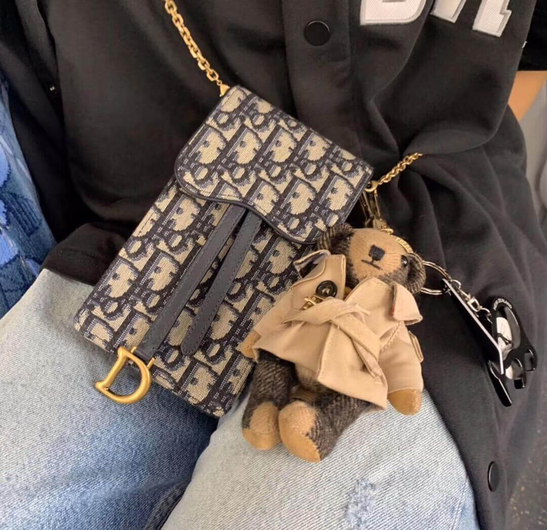 This clutch bag is finely crafted of navy blue on beige Dior monogram canvas. The bag features an aged gold chain shoulder strap and a hanging "D" charm. The top opens to a beige fabric interior with leather card slots.