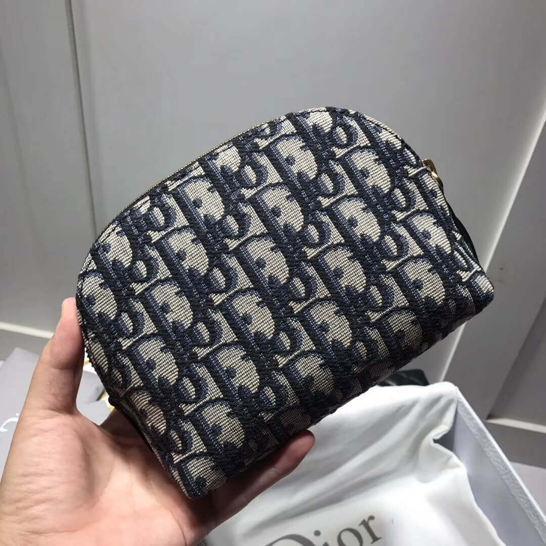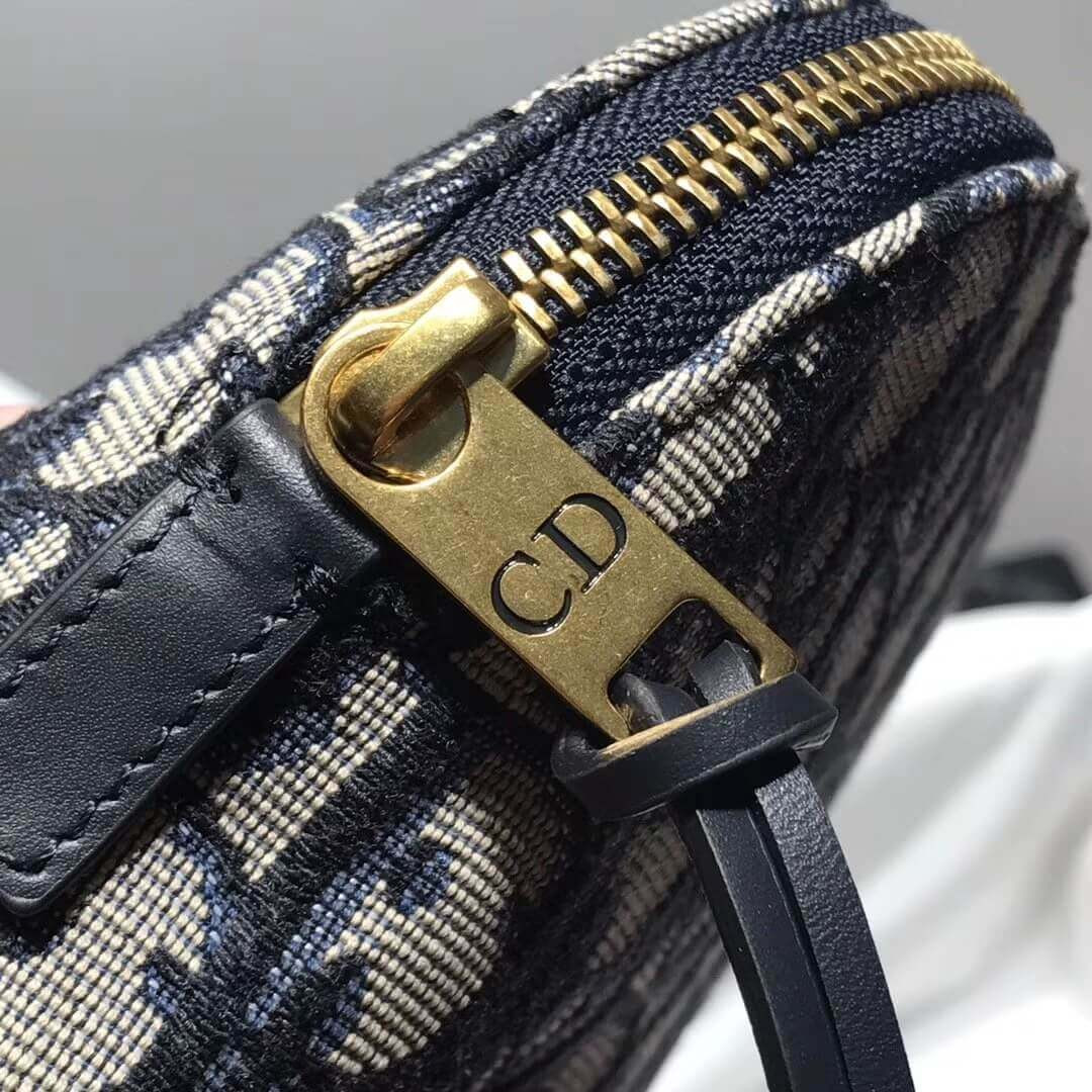 Small beauty bag in blue Dior Oblique jacquard canvas with blue calfskin leather details.