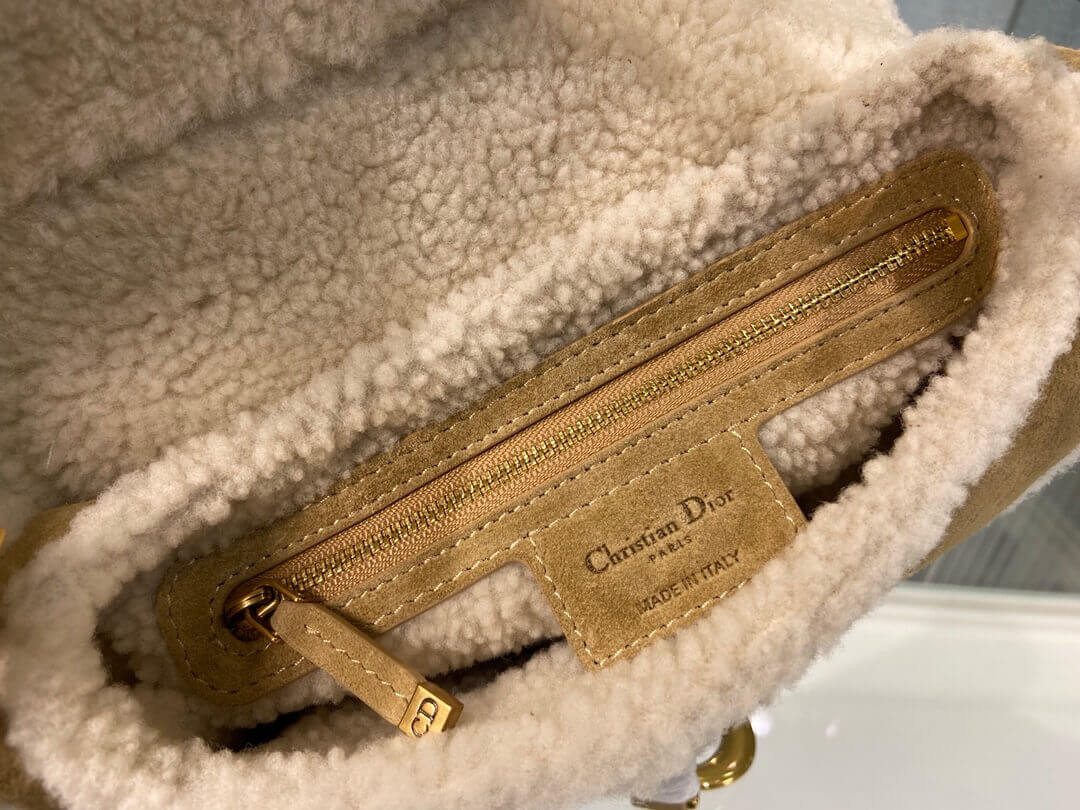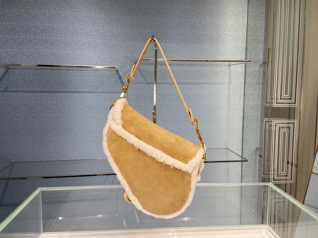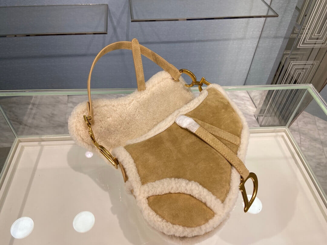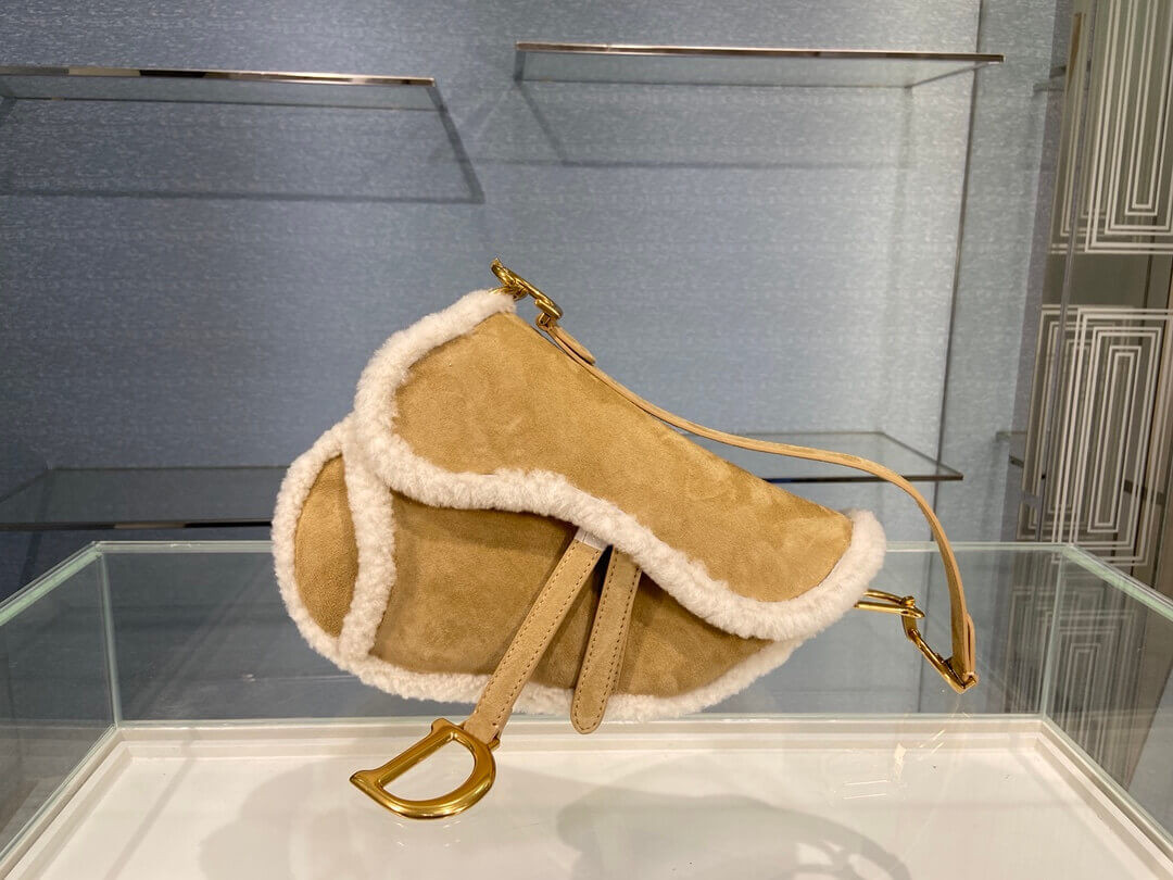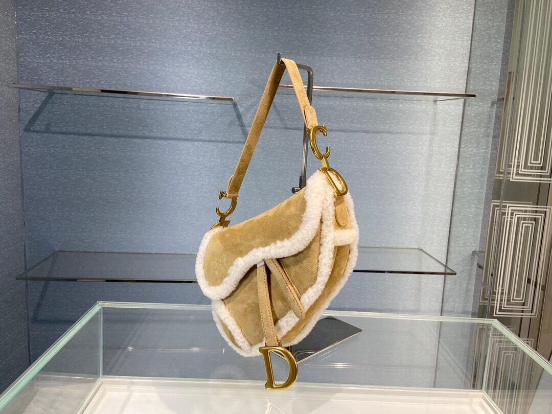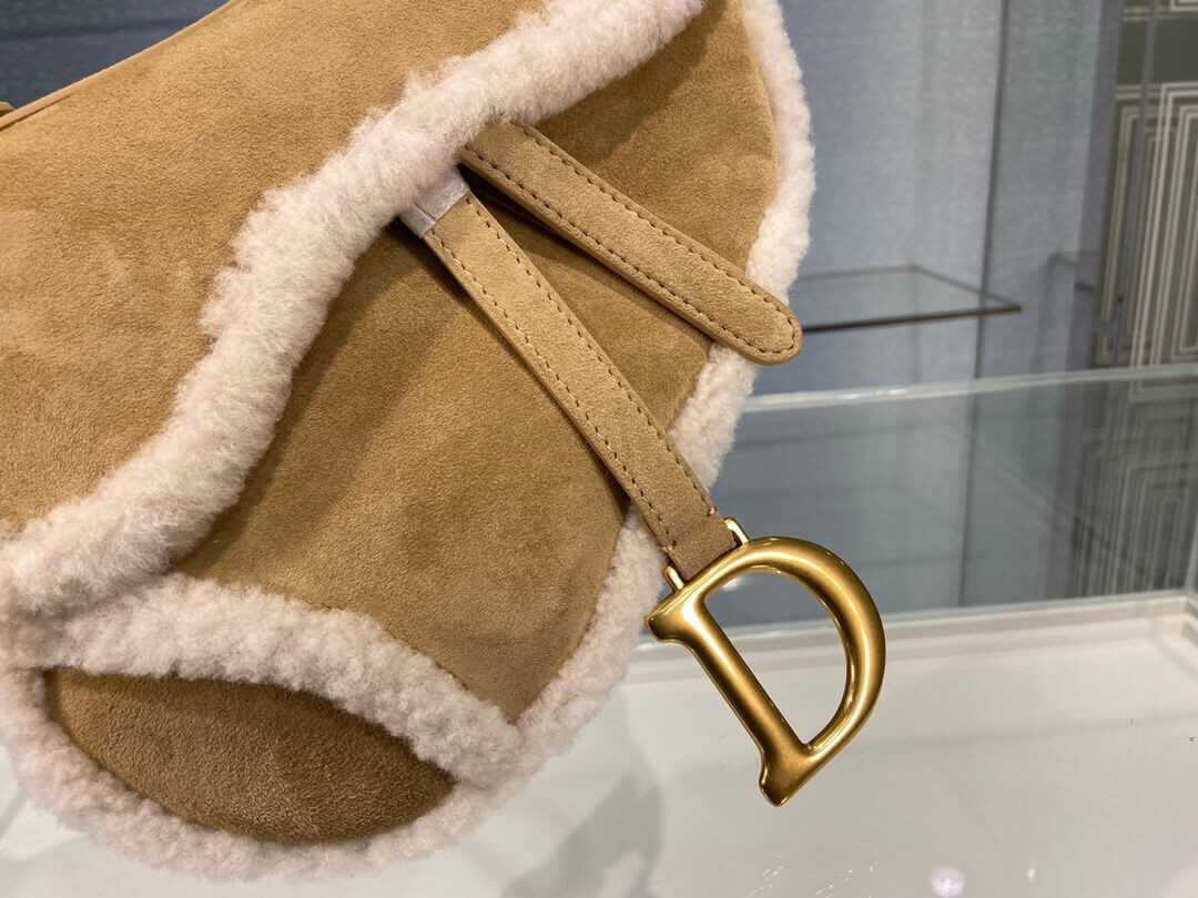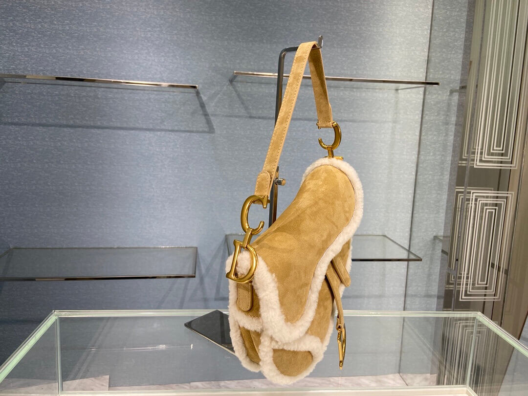 Maria Grazia Chiuri brings a fresh update to the iconic Saddle bag with an eye-catching design. This heritage style showcases the emblematic 'D'-stirrup magnetic clasp and saddle flap with the signature 'CD' structure on both sides of the handle, giving it an instantly modern feel. Crafted in camel-colored shearling and embellished with antique gold-finish hardware, this medium style may be customized with alternative straps.