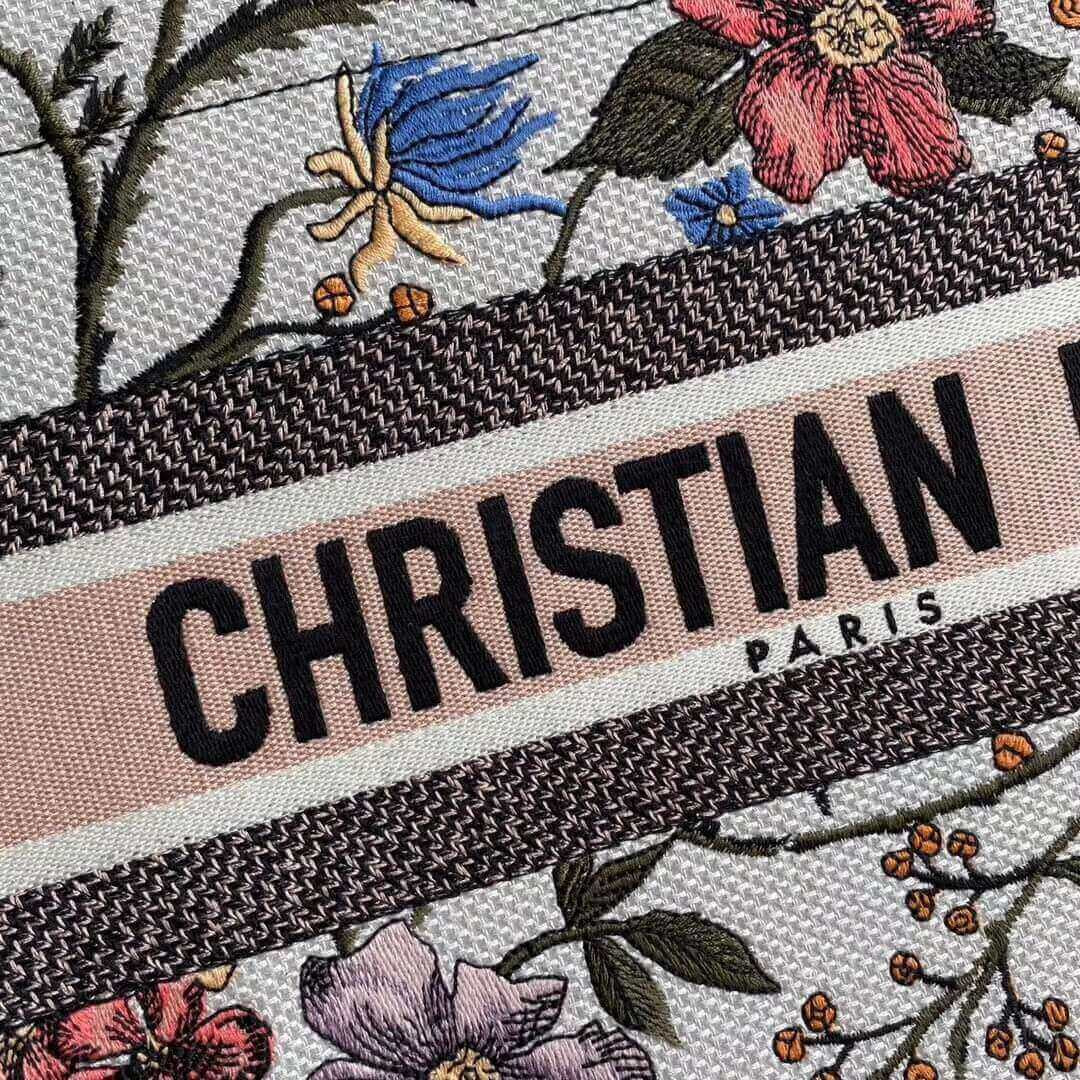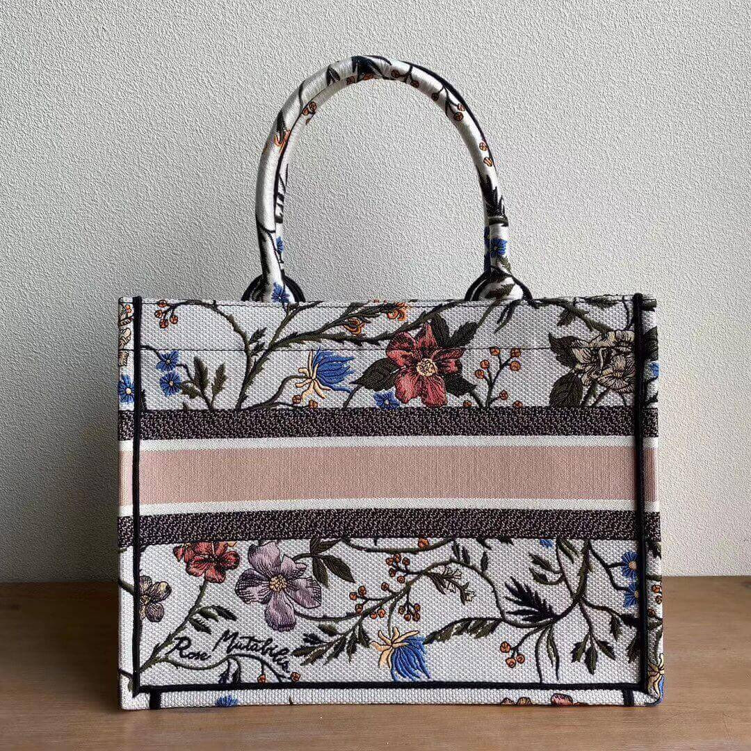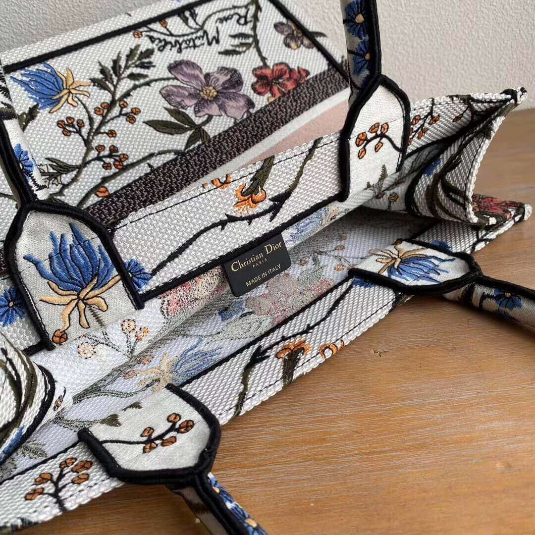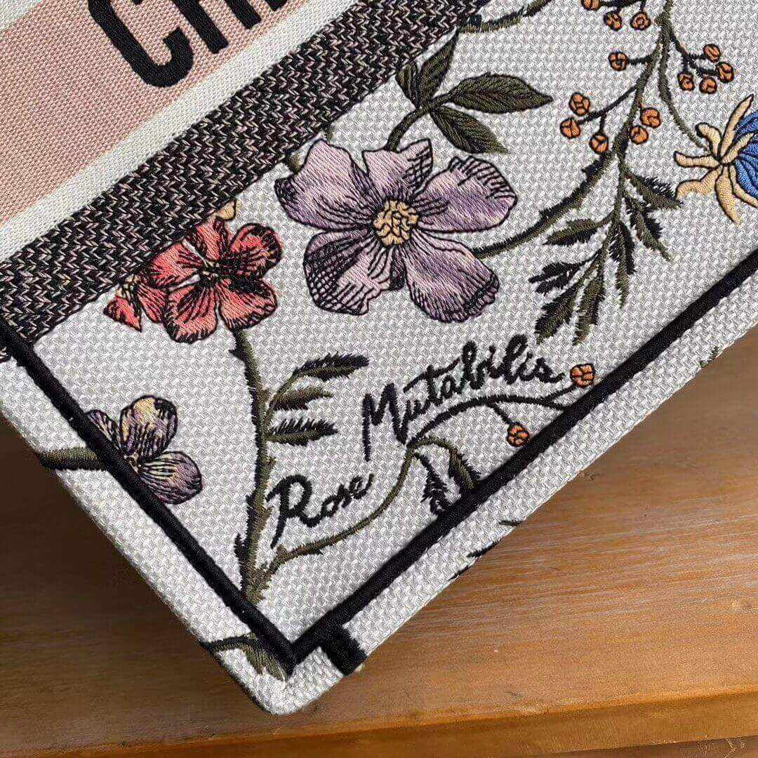 The Dior Book Tote, an original style introduced by Creative Director Maria Grazia Chiuri, has become a staple of the Dior aesthetic. Ideally designed to carry all your daily essentials, the small shape portrays a fully embroidered Rosa Mutabilis motif with the 'Christian Dior' signature on the front. This carryall is a perfect example of the Dior savoir-faire and combines well with small accessories like the Mitzah scarf.