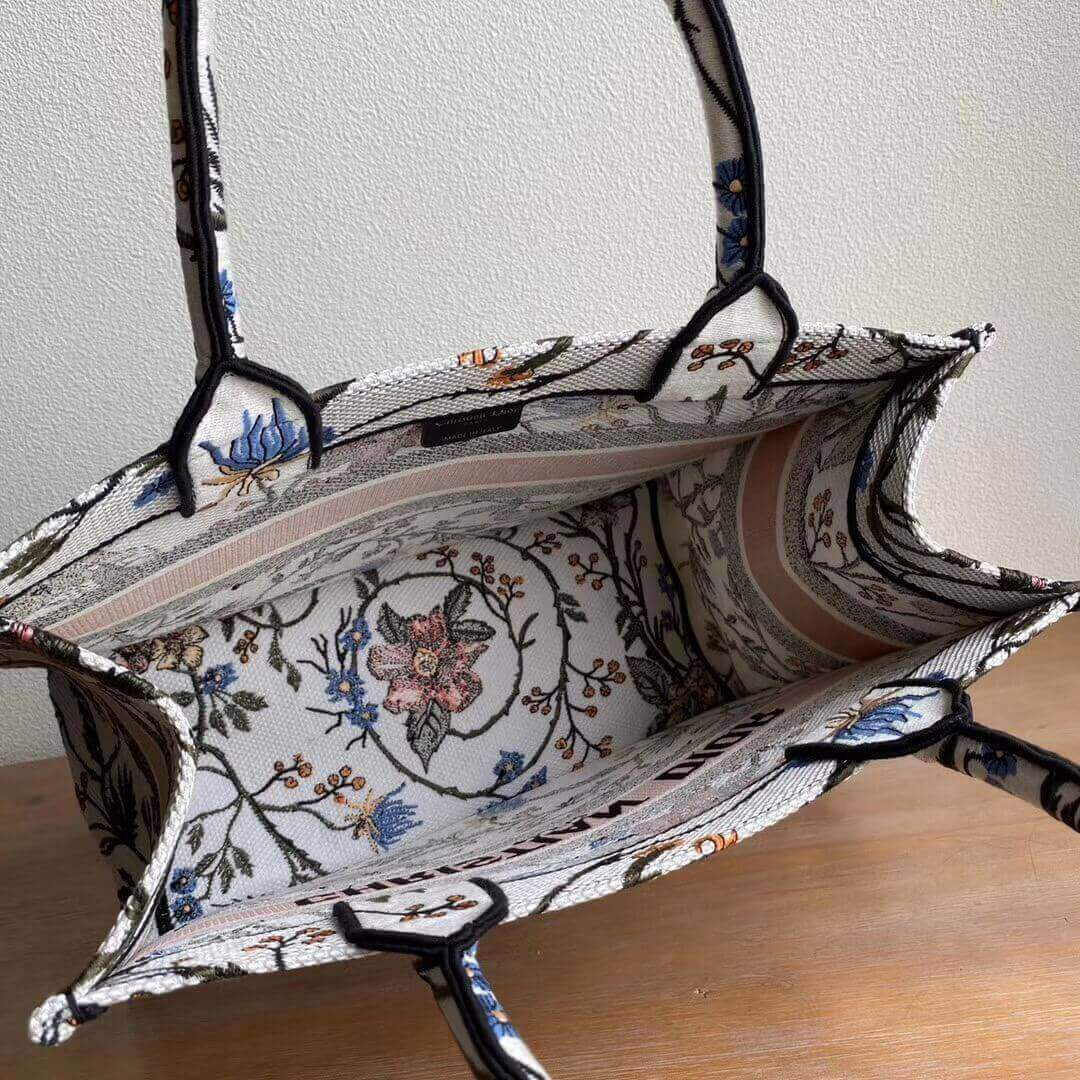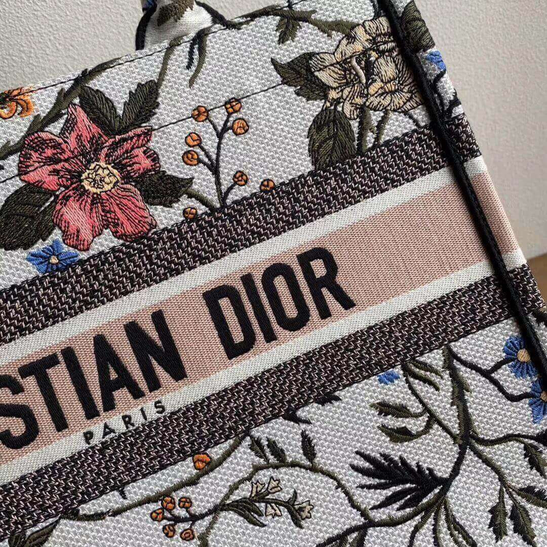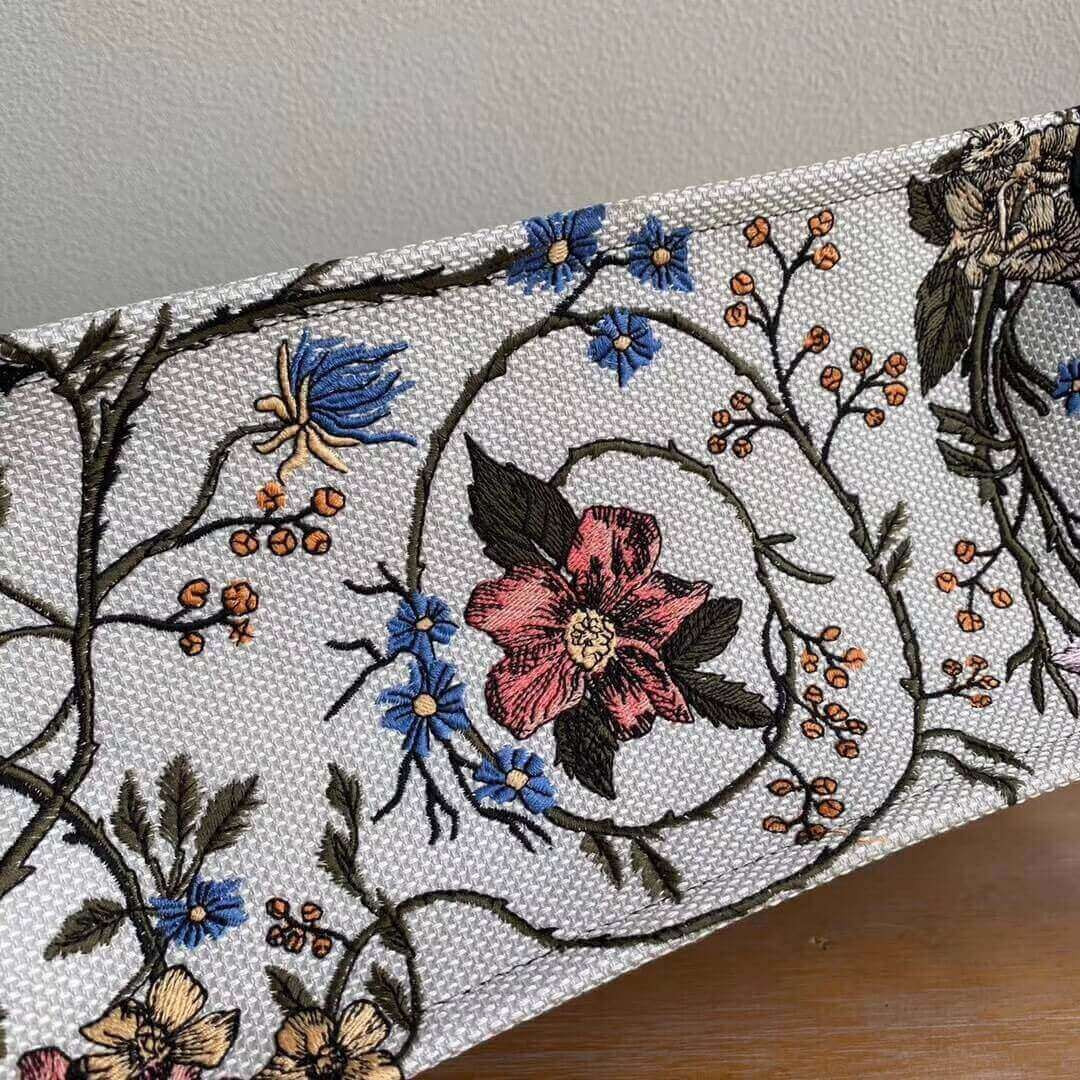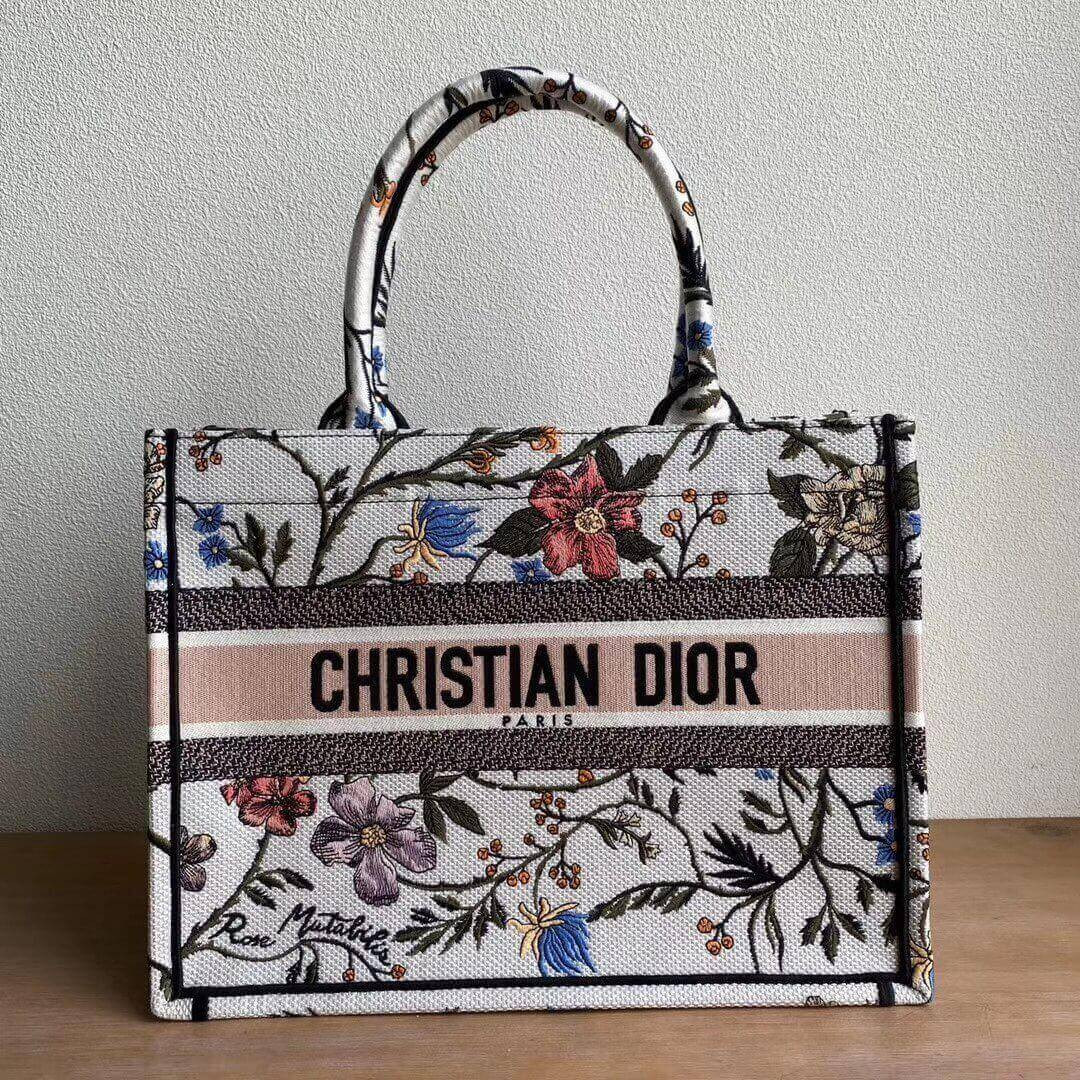 The Dior Book Tote, an original style introduced by Creative Director Maria Grazia Chiuri, has become a staple of the Dior aesthetic. Ideally designed to carry all your daily essentials, the small shape portrays a fully embroidered Rosa Mutabilis motif with the 'Christian Dior' signature on the front. This carryall is a perfect example of the Dior savoir-faire and combines well with small accessories like the Mitzah scarf.