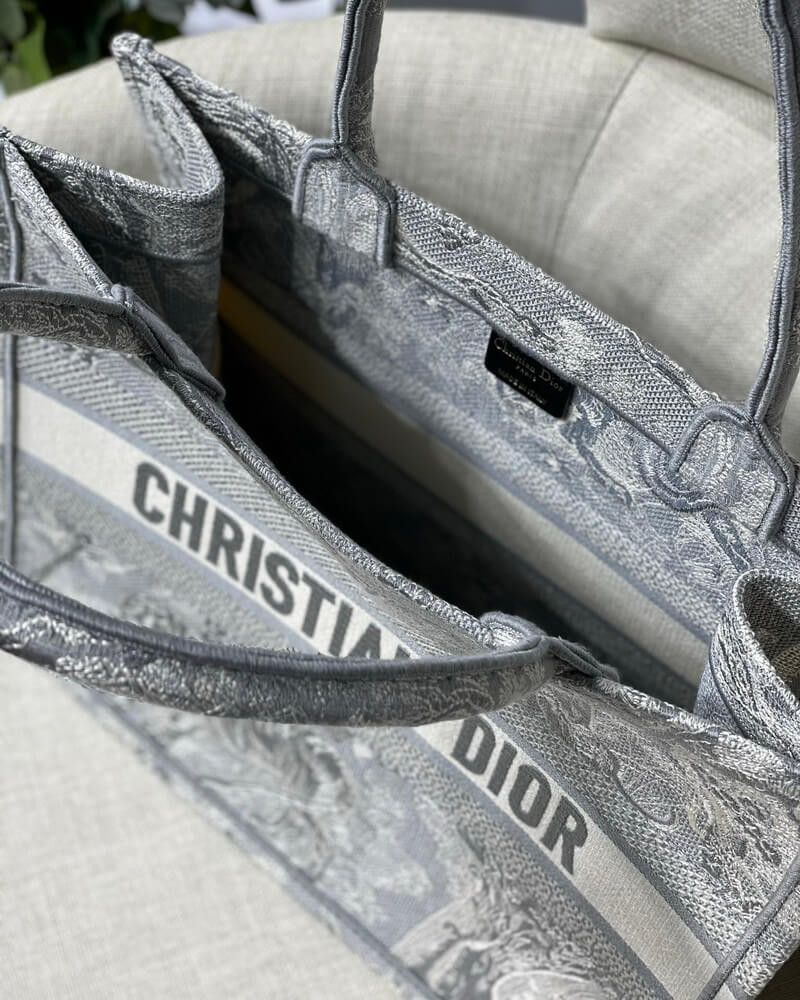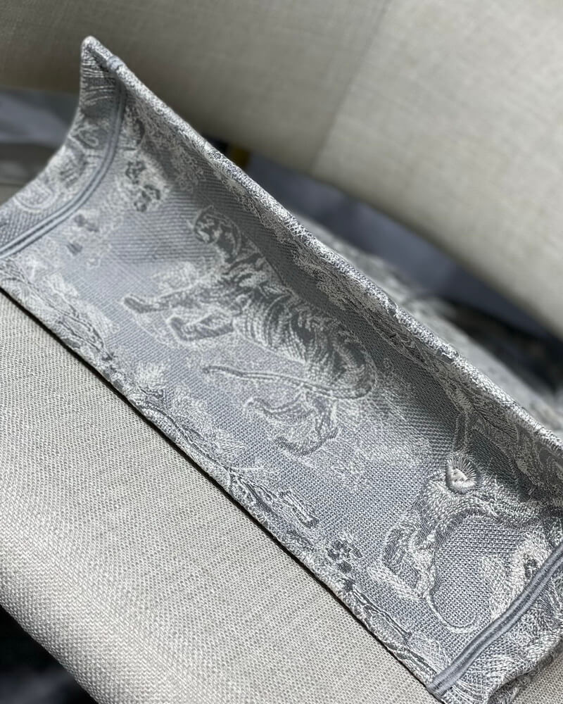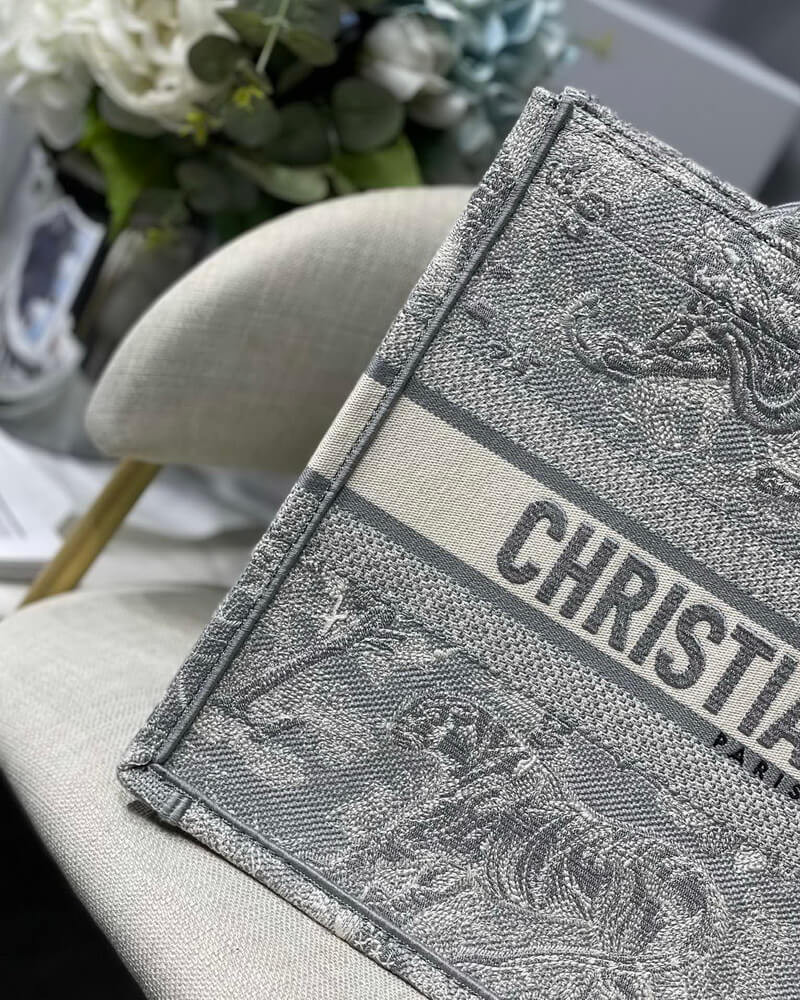 Grey‘Toile de Jouy’ embroidered book tote bag. Logo at the front.