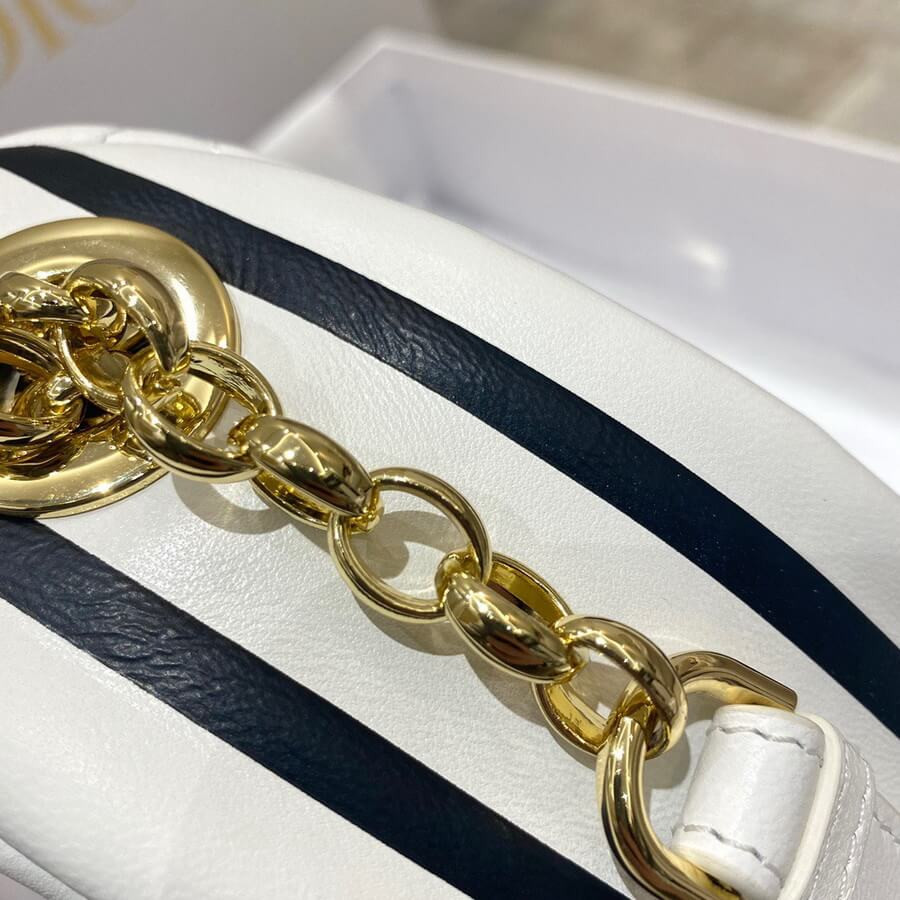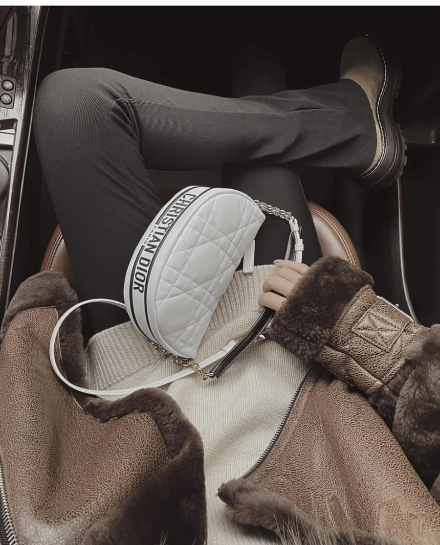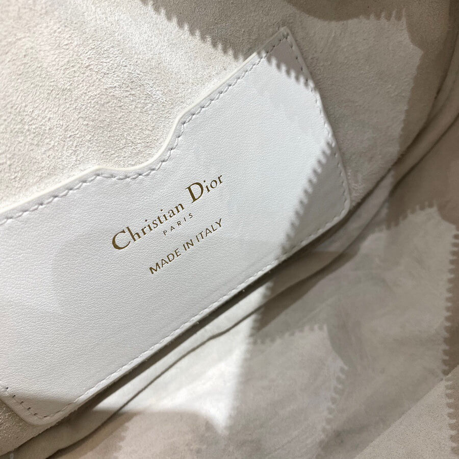 New this season, Maria Grazia Chiuri imagines the Dior Vibe bag with the allure of a Hobo bag showcasing modern lines. The white Cannage lambskin style has a suede calfskin interior while a black 'CHRISTIAN DIOR PARIS' signature adorns the bottom of the bag. Featuring a handle in addition to a removable and adjustable shoulder strap with a military-inspired buckle, the small Dior Vibe bag can be carried by hand, worn on the shoulder or crossbody for a sportier look.