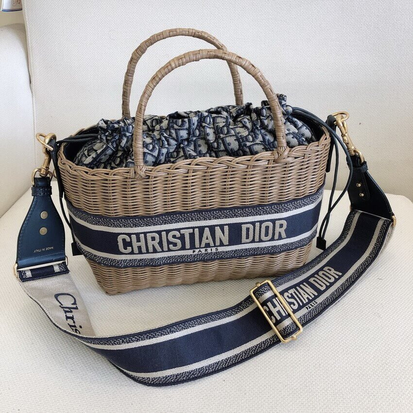 The Dior Wicker basket is a timeless creation traditionally crafted in natural hand-woven wicker and exemplifies Dior's savoir-faire. The design features a blue Dior Oblique jacquard interior pouch with zipped pocket and a drawstring closure. Inspired by the hallmark Dior Book Tote, it showcases a band embroidered with the 'CHRISTIAN DIOR' signature, while the wide embroidered shoulder strap allows it to be worn over the shoulder or crossbody.