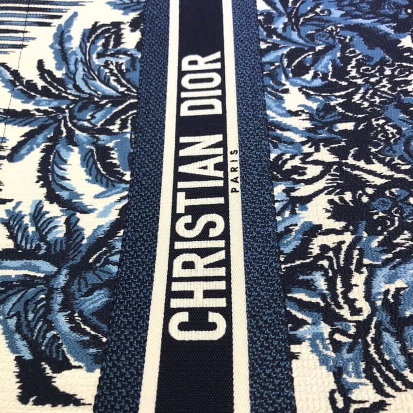 The Dior Book Tote, an original style introduced by Creative Director Maria Grazia Chiuri, has become a staple of the Dior aesthetic. Designed to carry all the daily essentials, the silhouette offers a new take on the hallmark Toile de Jouy with a fully embroidered variation with the blue Dior Palms motif. The front boasts a 'Christian Dior' signature while a graphic motif adorns the sides for a contrasting modern touch. The carryall is a prime example of Dior savoir-faire.
