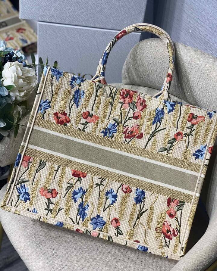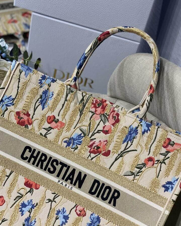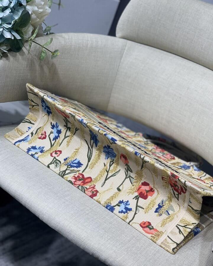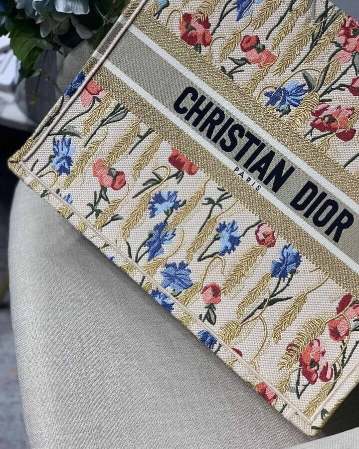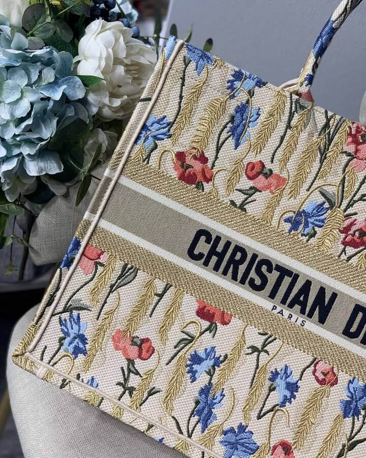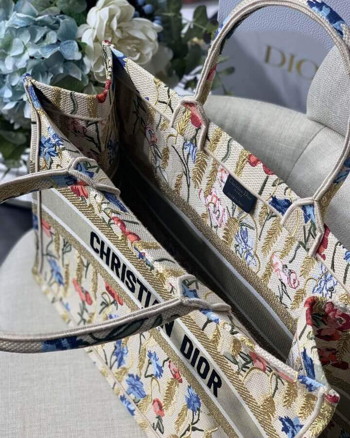 The Dior Book Tote, an original style introduced by Creative Director Maria Grazia Chiuri, has become a staple of the Dior aesthetic. This small beige style, fully embroidered with the multicolor Dior Hibiscus motif accented with metallic thread, is reminiscent of bucolic Apulian landscapes, a central theme of the collection. Adorned with the 'Christian Dior' signature, the Dior Book Tote exemplifies the House's signature savoir-faire and can be paired with other Dior Hibiscus creations from the collection.
