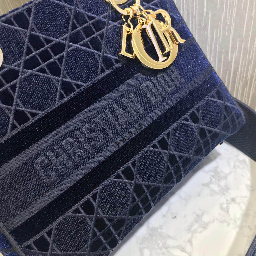 The Lady D-Lite handbag epitomizes Dior's vision of elegance and beauty. A sleek and feminine blue velvet bag that is fully embroidered with the Cannage motif in contrasting matte cotton thread and features a tonal 'Christian Dior' signature on the front. The pale gold signature 'D. I. O. R.' charms embellish the classic silhouette. This medium style has a large, fully embroidered and removable shoulder strap and can be worn many ways.