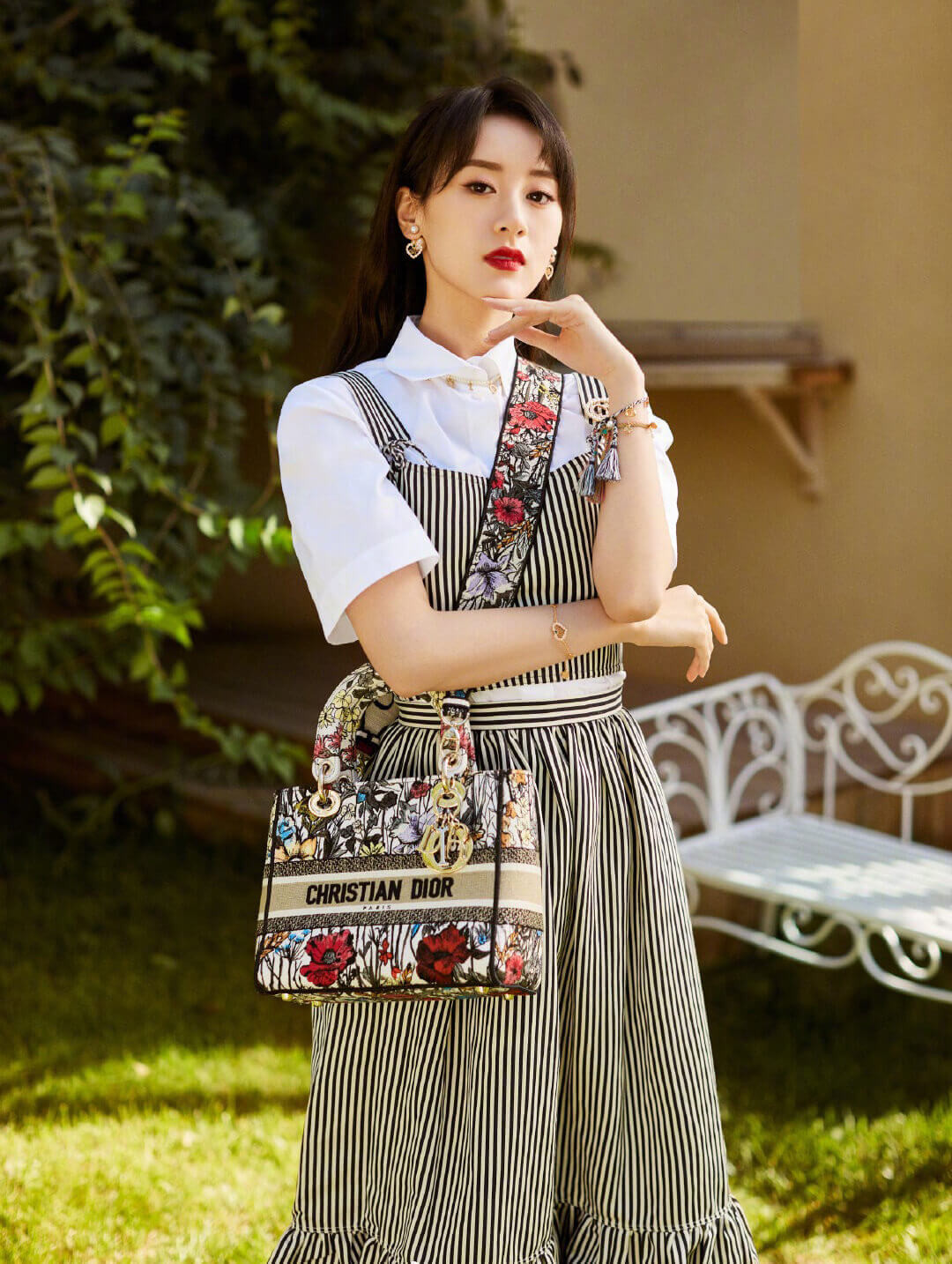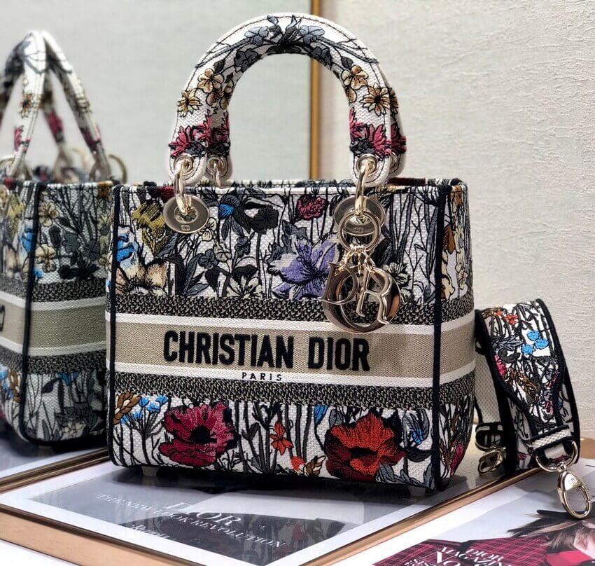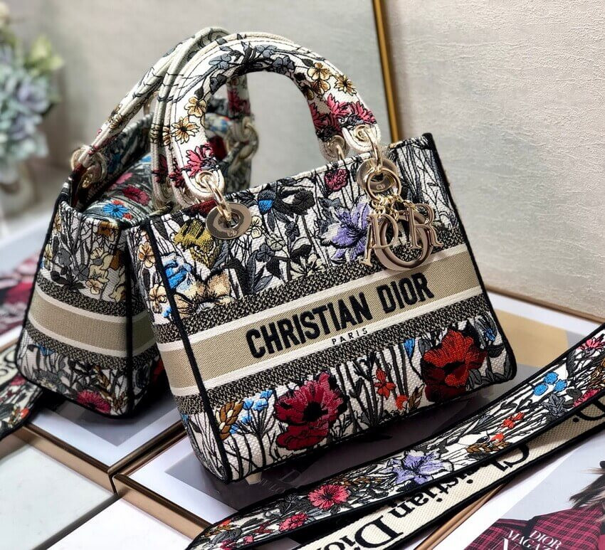 The Lady D-Lite bag combines classic elegance with the modernity of the House. The lightweight silhouette is embroidered with the Mille Fleurs motif which, inspired by bucolic Apulian landscapes, is a central theme of the collection. Featuring the 'Christian Dior' signature on the front along with the thick pale gold-finish metal 'D.I.O.R.' charms, it is equipped with a wide, reversible and removable embroidered shoulder strap. The medium bag can be carried by hand, worn over the shoulder or crossbody and can be paired with other Mille Fleurs creations of the season.