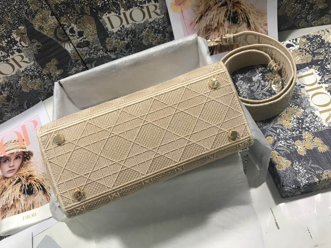 The Lady D-Lite handbag epitomizes Dior's vision of elegance and beauty. A sleek, feminine bag, it's timeless yet modern. Crafted in fully embroidered gray stone Cannage canvas with a 'Christian Dior' signature on the front, its supreme finishing instantly stands out. The pale gold-tone signature 'D. I. O. R.' charms embellish its silhouette. This medium style has a large fully embroidered, removable shoulder strap.