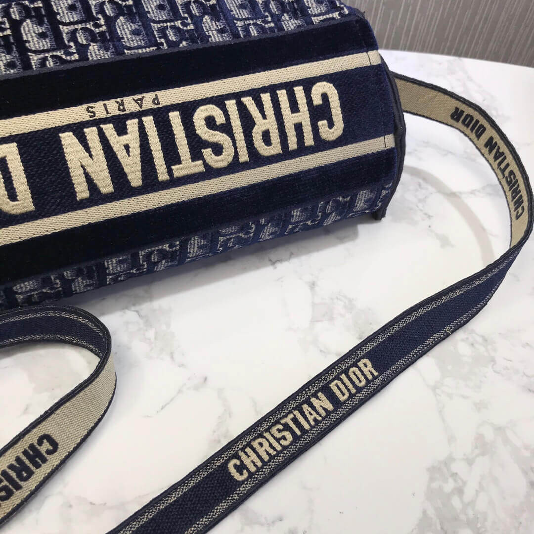The Diorcamp bag is Maria Grazia Chiuri's update to the classic messenger bag, incorporating signature Dior elements for a relaxed yet contemporary look. The bag is crafted in blue velvet that is entirely embroidered with the Dior Oblique motif, and features the iconic 'Christian Dior' signature across the front flap. Its spacious form and ease of wear make it an effortless daily companion.