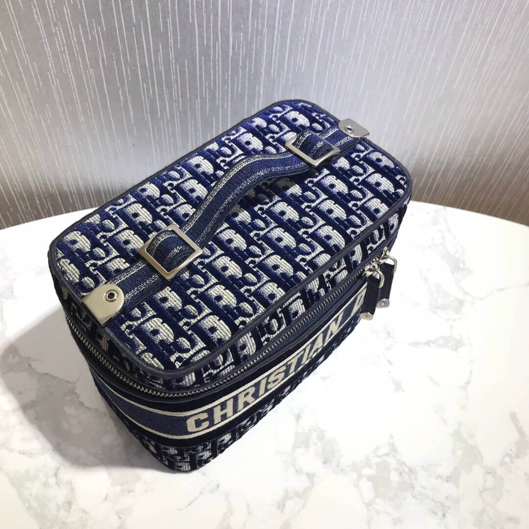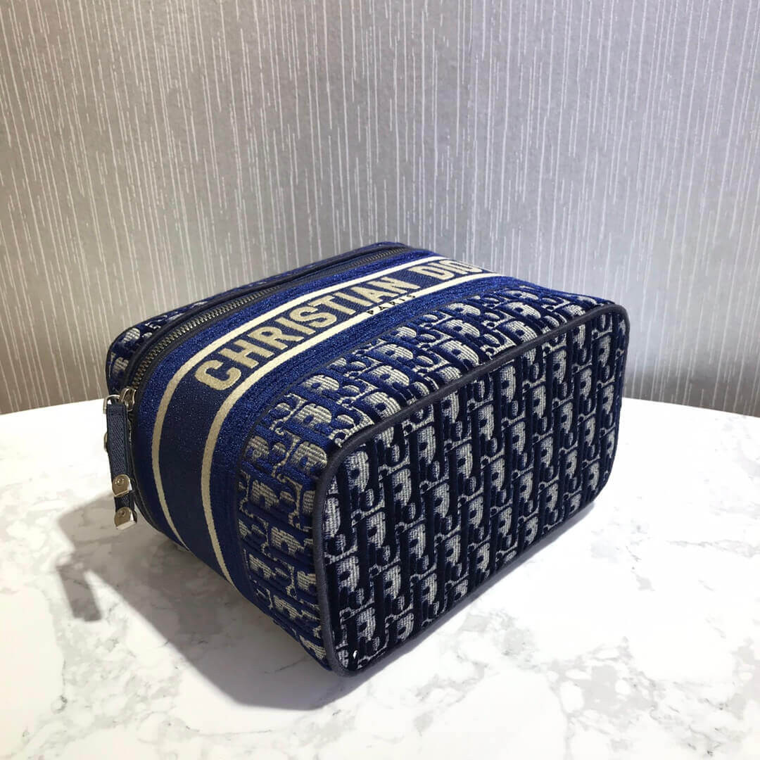 The DiorTravel vanity case is both elegant and practical. Portraying the signature Dior Oblique motif, it is made with blue velvet and embroidered with contrasting matte cotton thread, for a textured feel. It features a 'Christian Dior' signature and opens on a spacious main compartment with several pockets to accommodate all your toiletries and makeup. A perfect example of Dior savoir-faire, it is the ideal travel companion.