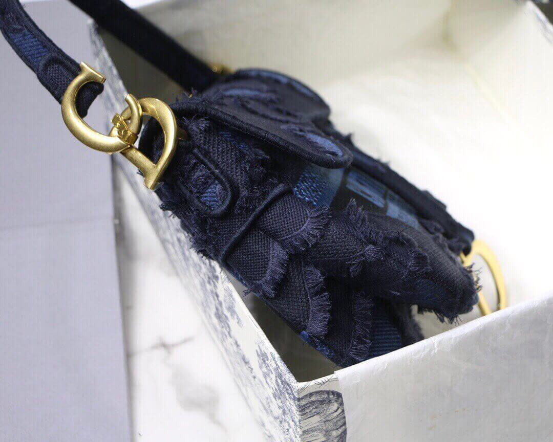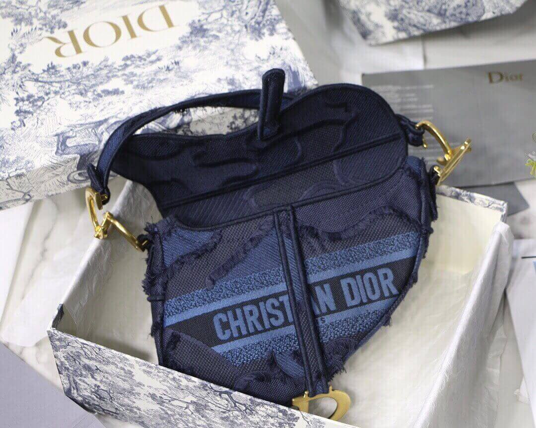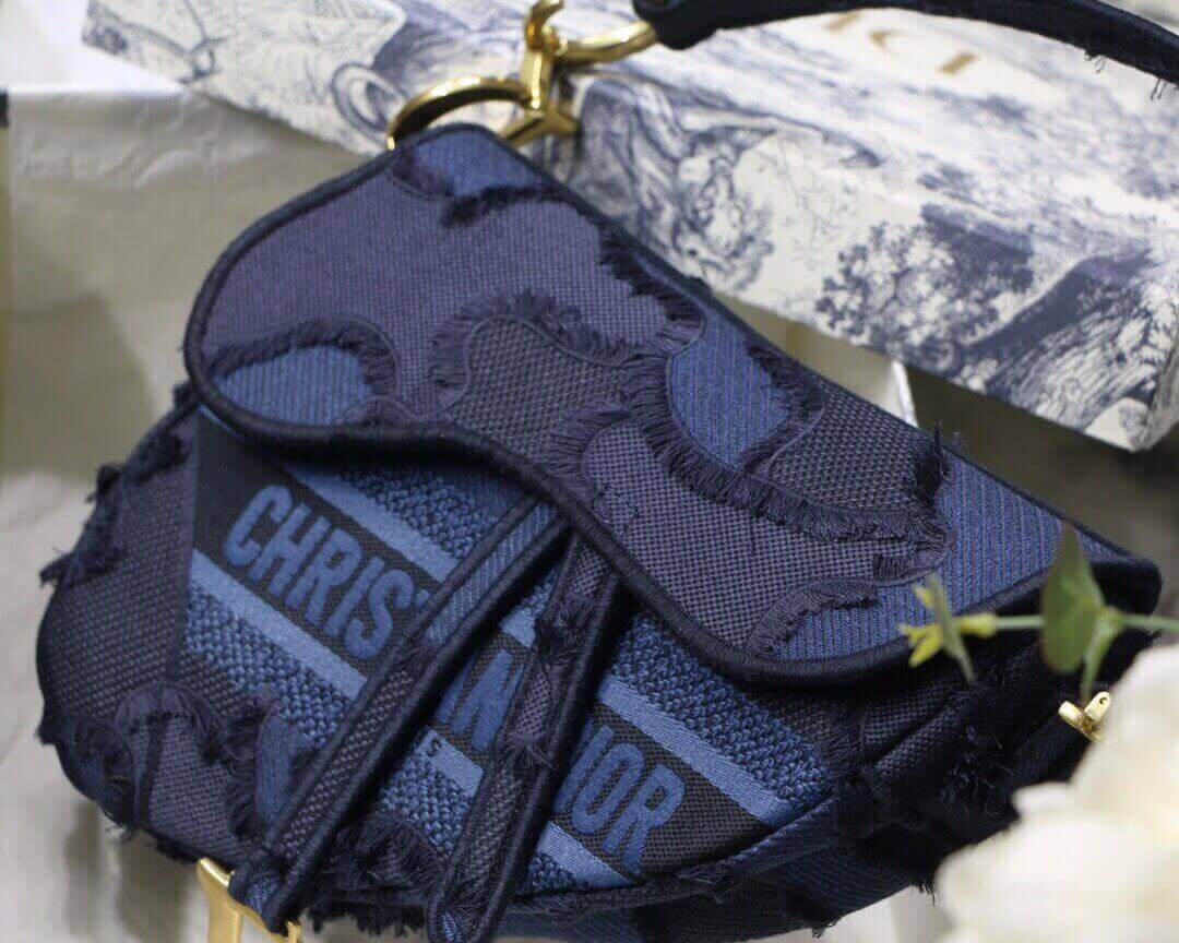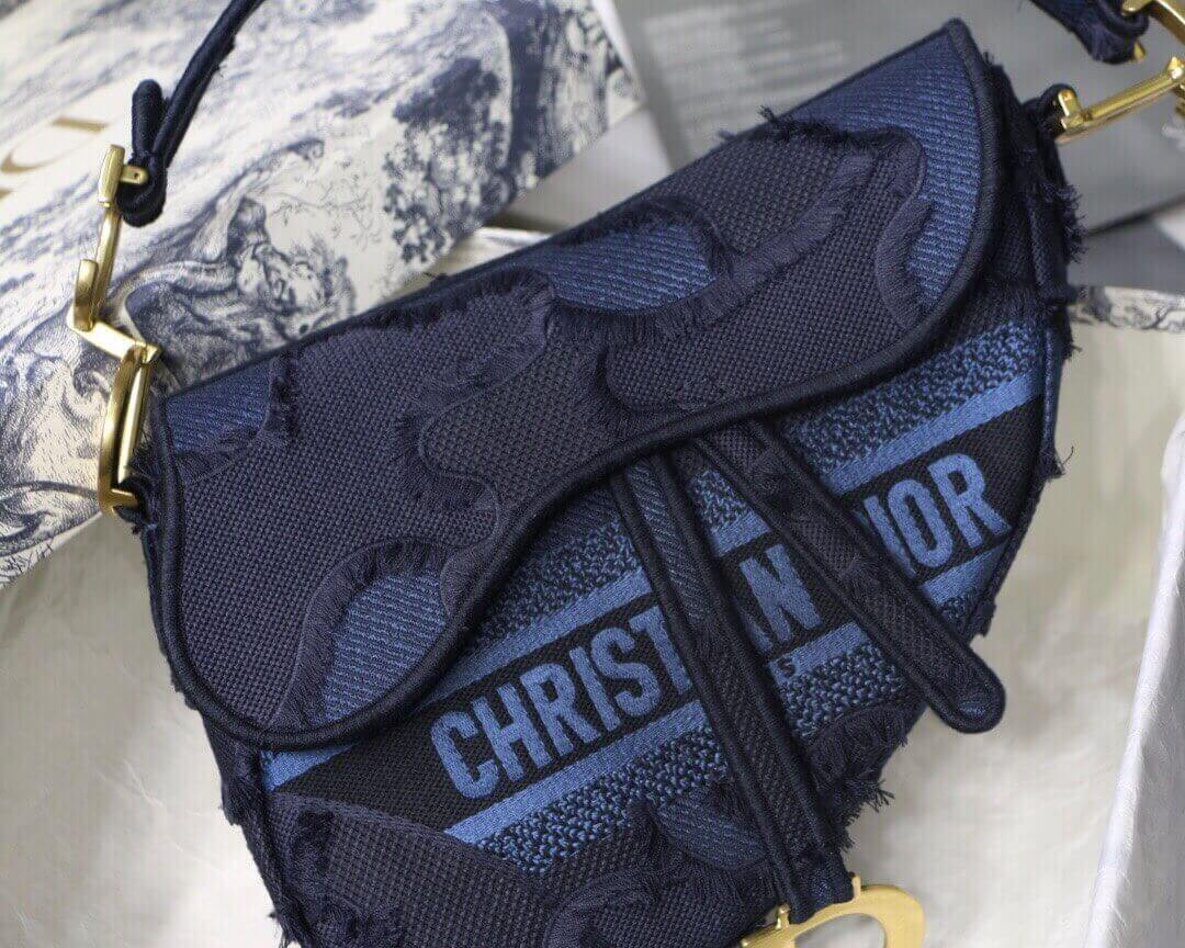 Maria Grazia Chiuri brings a fresh update to the iconic Saddle bag. The heritage design showcases the emblematic 'D'-stirrup magnetic clasp and Saddle flap with the signature 'CD' structure on both sides of the handle. The fully embroidered blue hand-fringed Camouflage style has the 'Christian Dior' signature on the front, and may be customized with alternative straps.