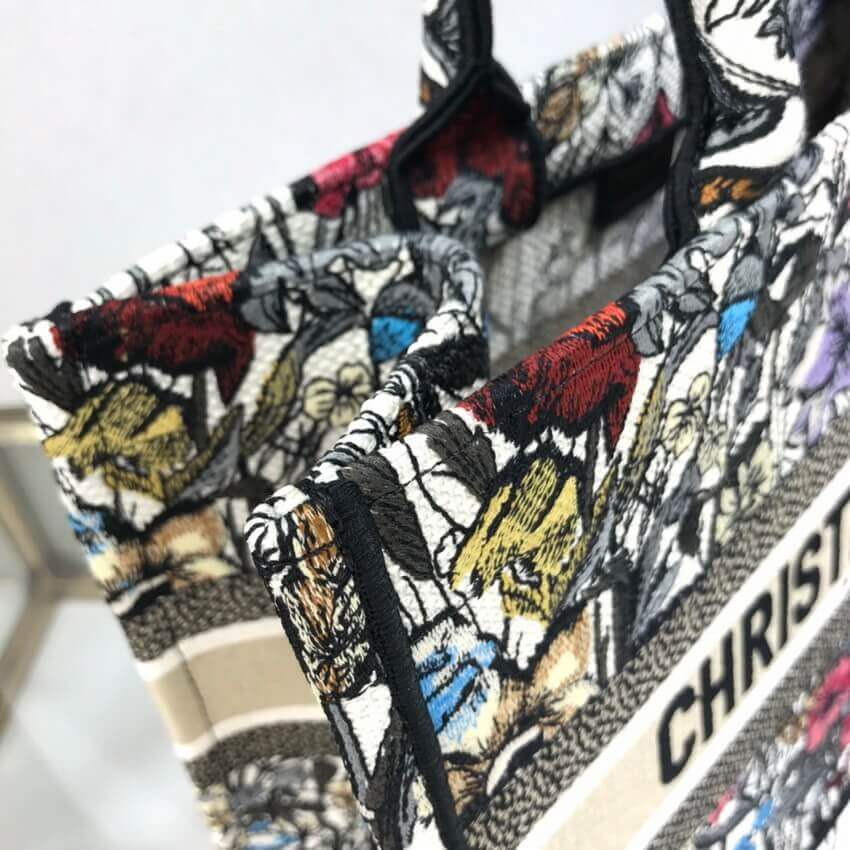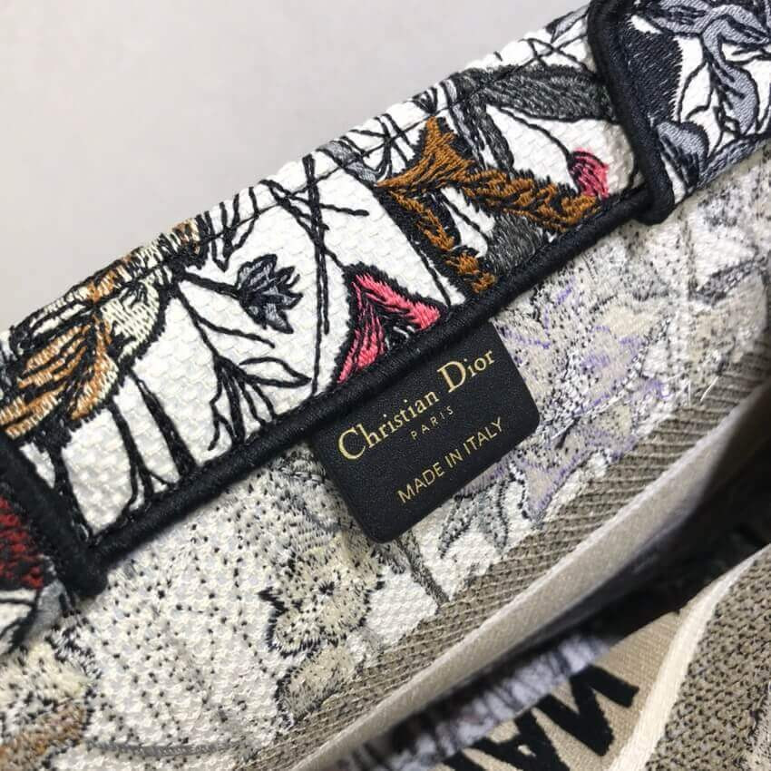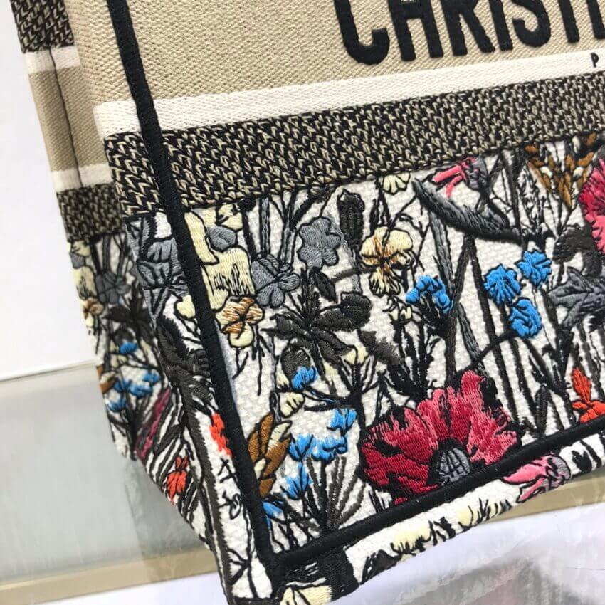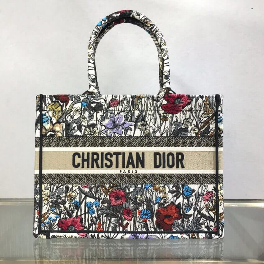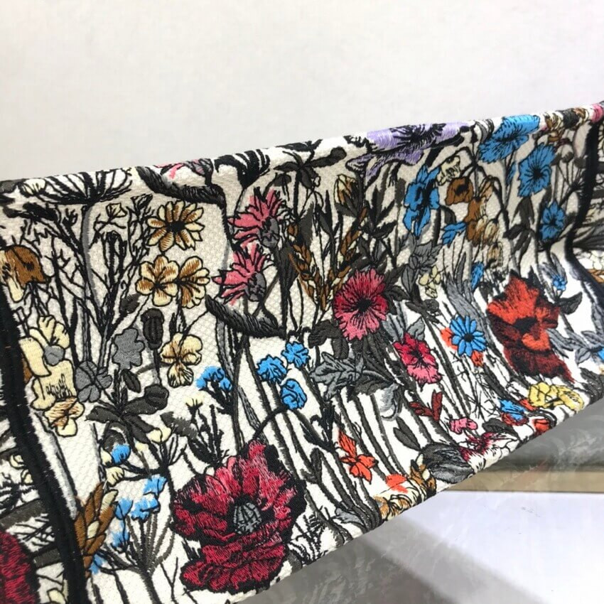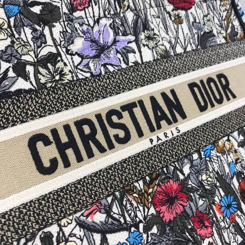 The Dior Book Tote, an original style introduced by Creative Director Maria Grazia Chiuri, has become a staple of the Dior aesthetic. This small style, fully embroidered with the Mille Fleurs motif, is reminiscent of bucolic Apulian landscapes, a central theme of the collection. Adorned with the 'Christian Dior' signature, the Dior Book Tote exemplifies the House's signature savoir-faire and can be paired with other Mille Fleurs creations from the collection.