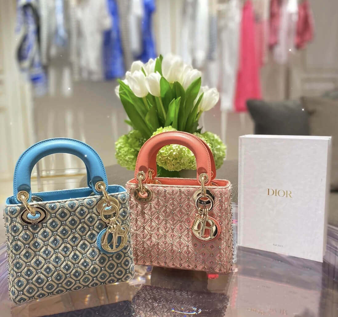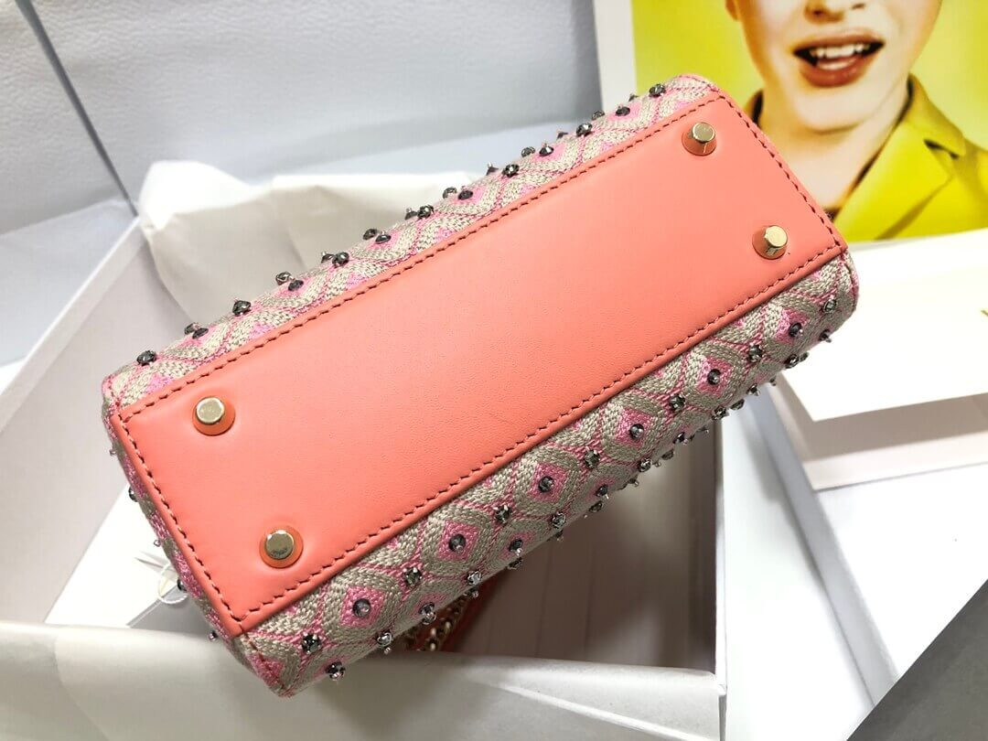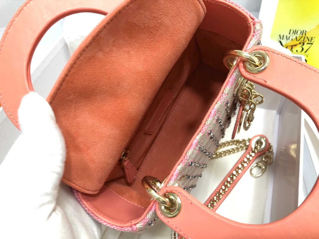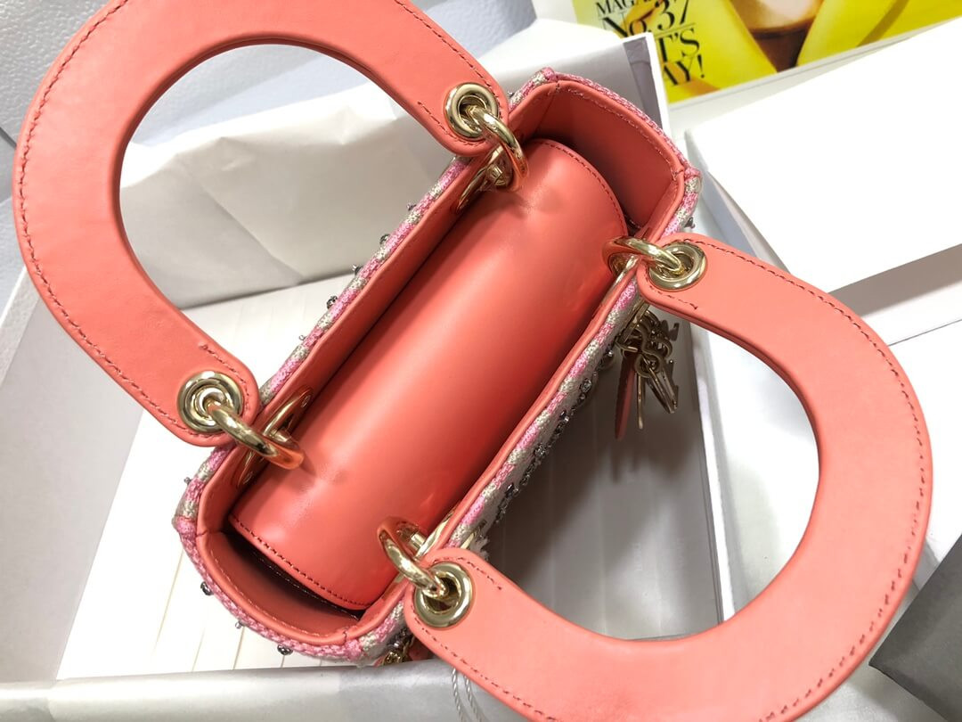 • Lady Dior Mini Coral Pink Two-Tone Thread Embroidery Bag M0505 With Honeycomb Pattern And Rhinestones