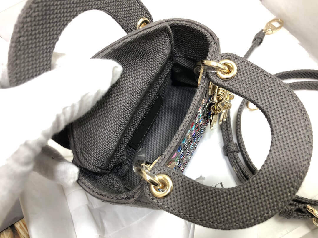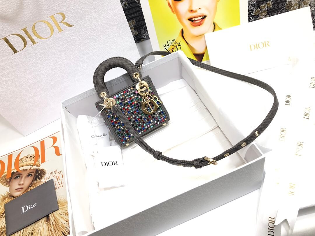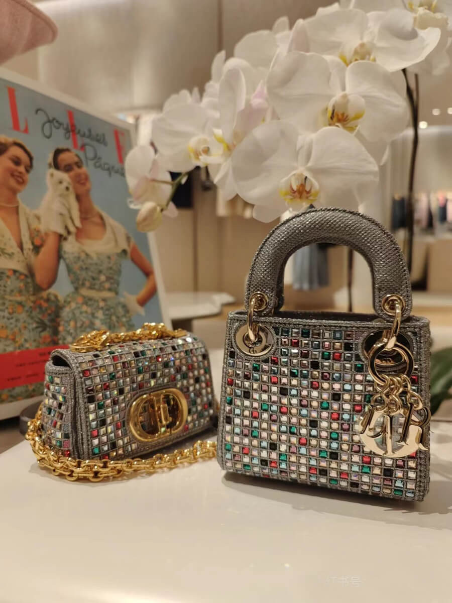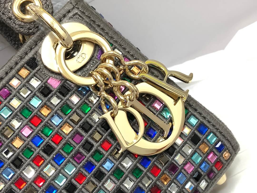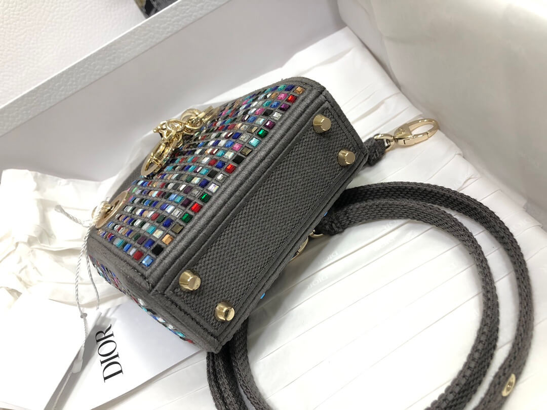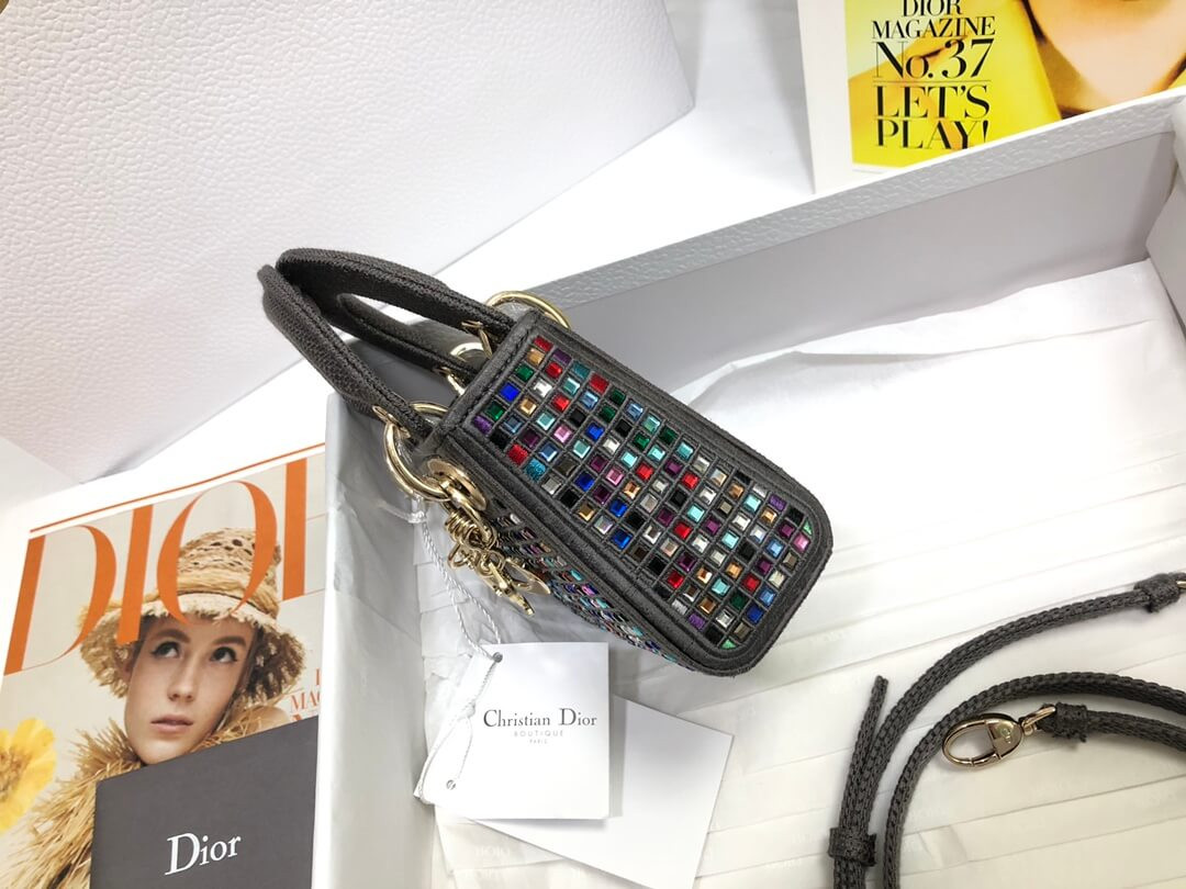 The Lady Dior bag embodies the House's vision of elegance and beauty. Crafted in dark pink metallic canvas embroidered with multicolor crystals, its iconic silhouette is embellished with a 'D.I.O.R.' charm. The micro style can accommodate all the small essentials. Thanks to top handles and an adjustable and removable shoulder strap, the versatile style can be carried by hand, worn over the shoulder or crossbody.