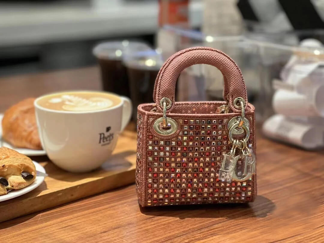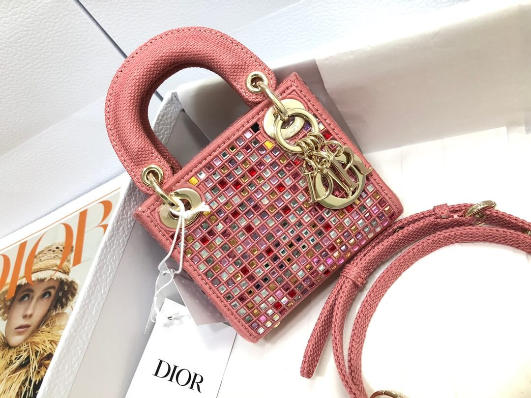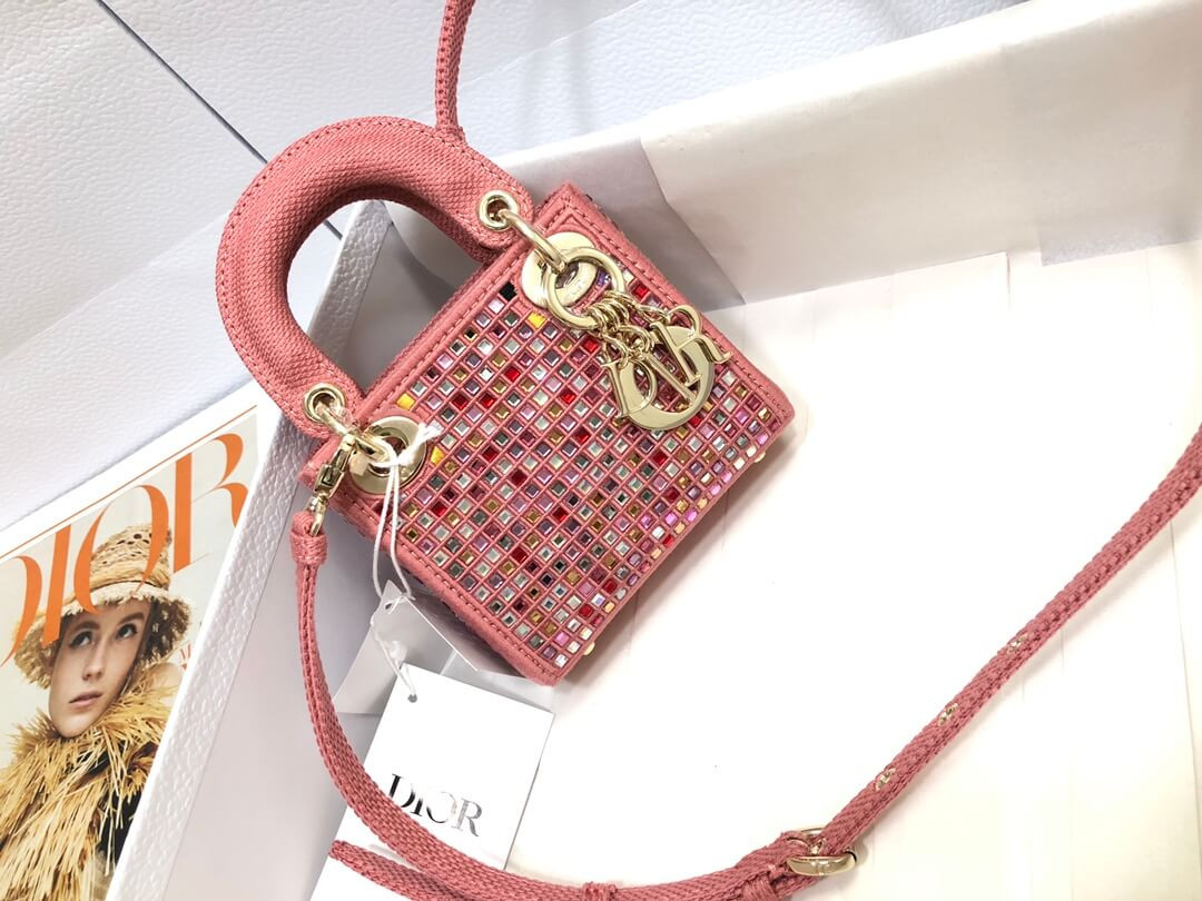 The Lady Dior bag embodies the House's vision of elegance and beauty. Crafted in dark pink metallic canvas embroidered with multicolor crystals, its iconic silhouette is embellished with a 'D.I.O.R.' charm. The micro style can accommodate all the small essentials. Thanks to top handles and an adjustable and removable shoulder strap, the versatile style can be carried by hand, worn over the shoulder or crossbody.