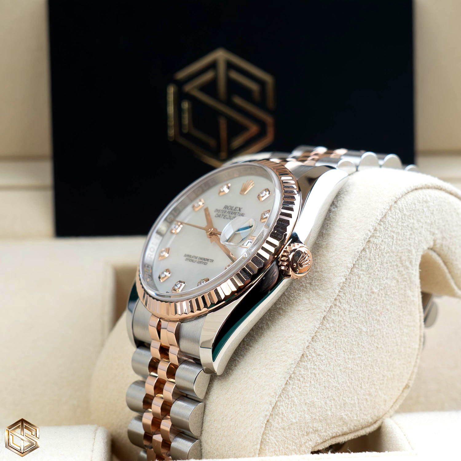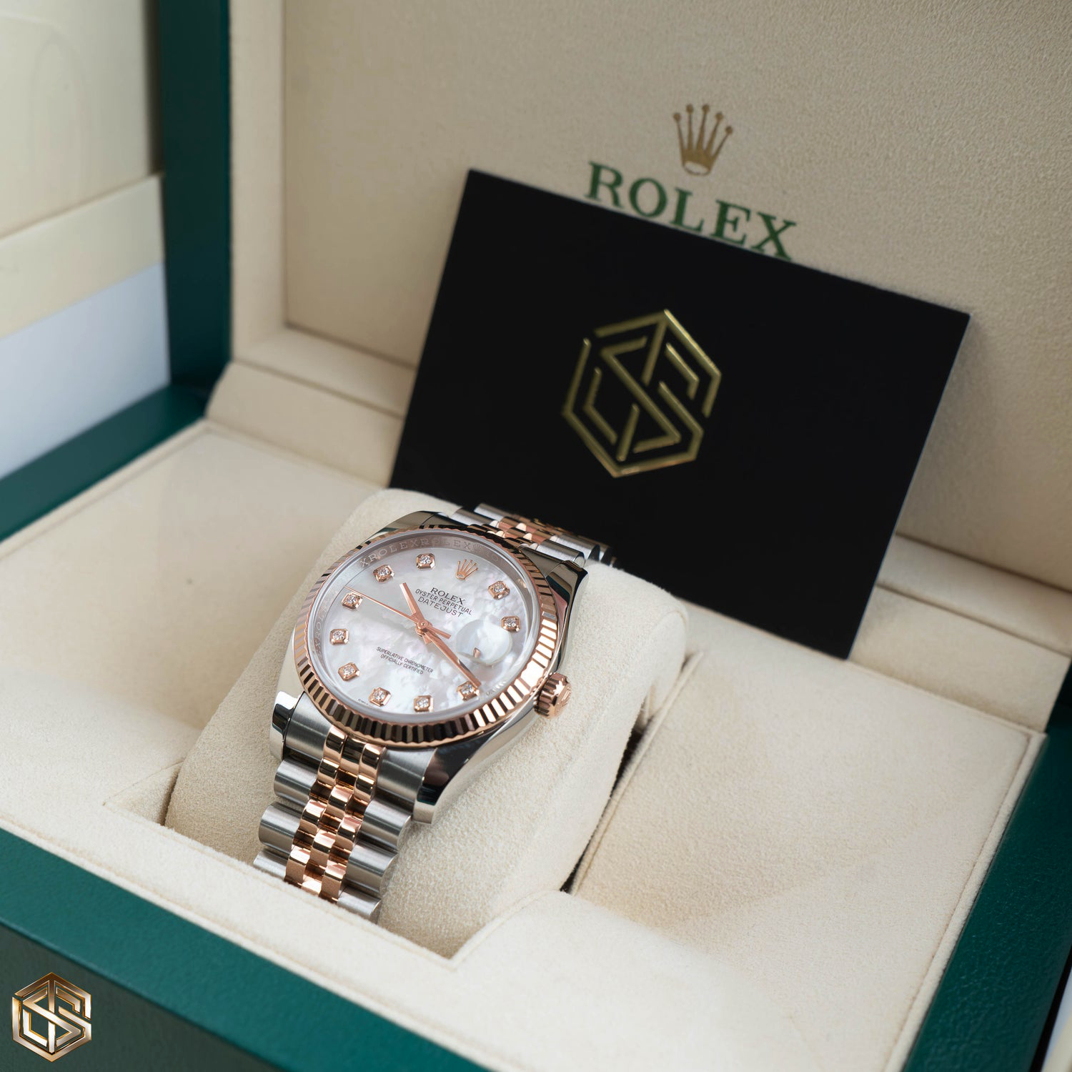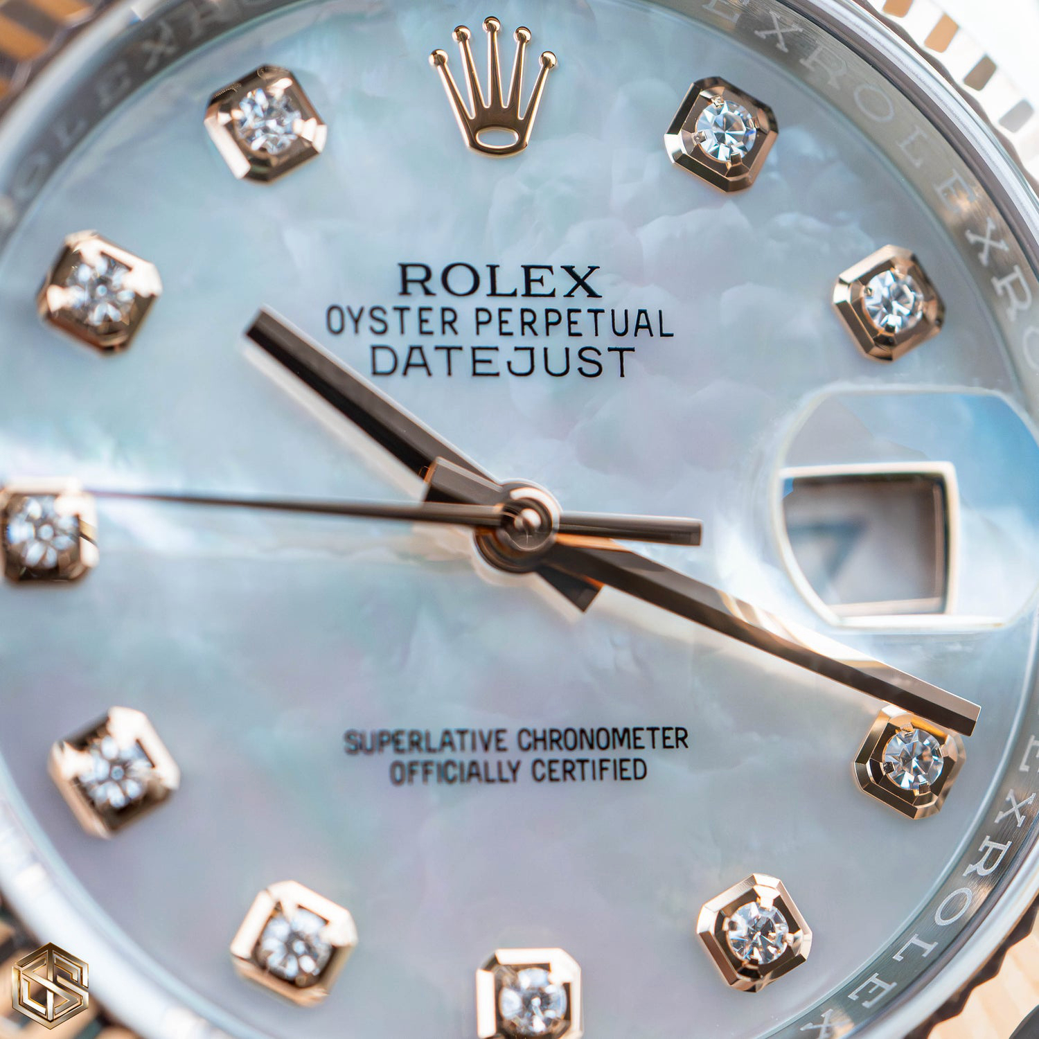 | Dial: | Mother of pearl dial with original Rolex factory diamond hour markers. Date calendar at 3 o'clock aperture. |