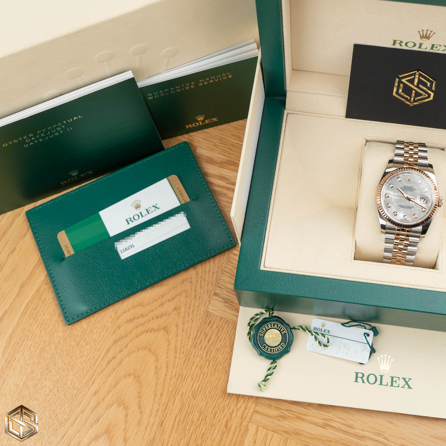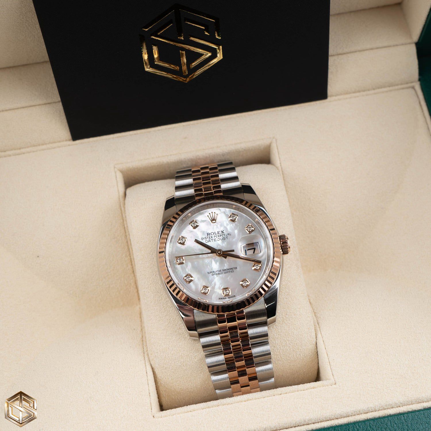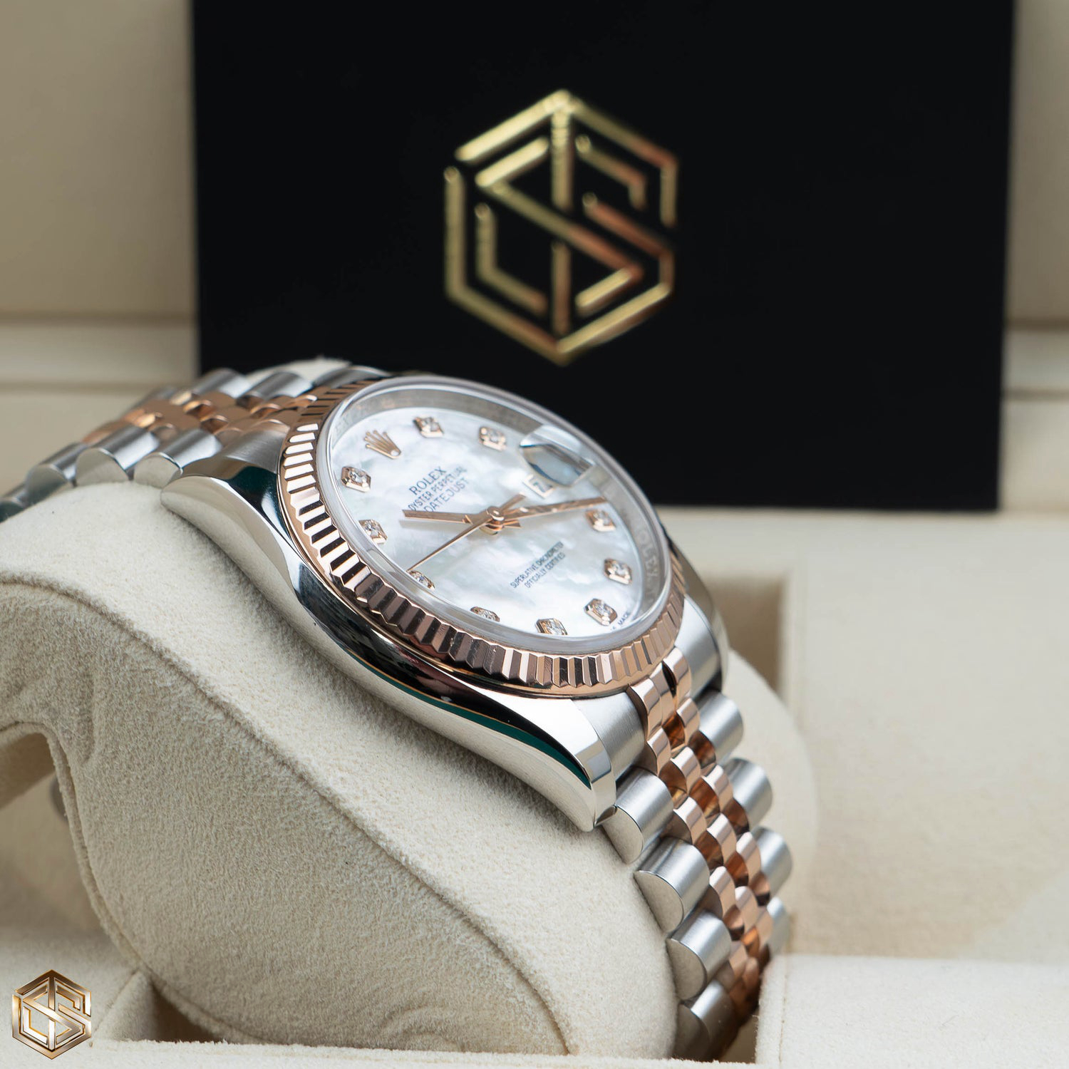 | Dial: | Mother of pearl dial with original Rolex factory diamond hour markers. Date calendar at 3 o'clock aperture. |