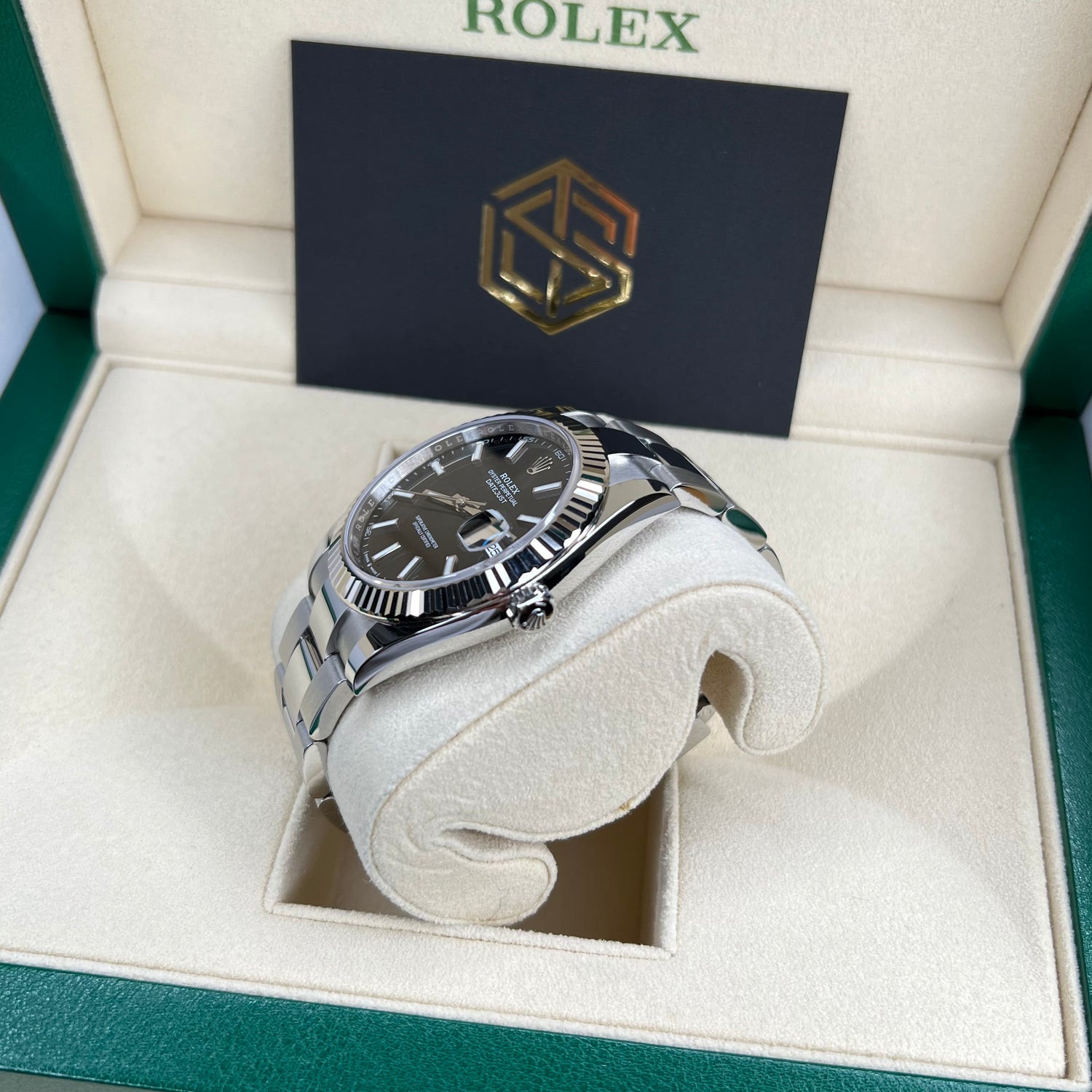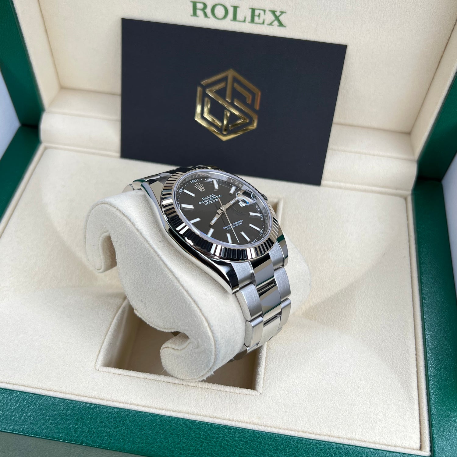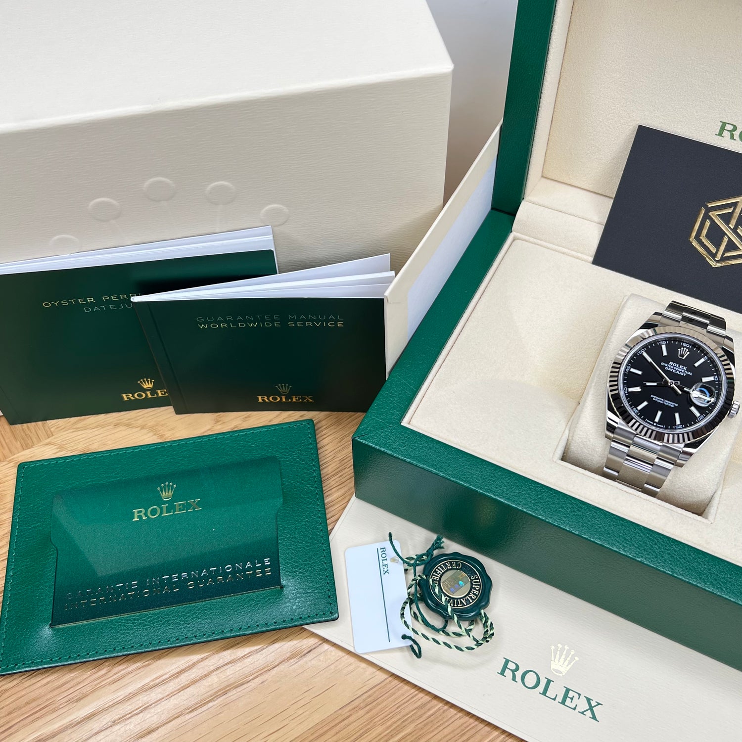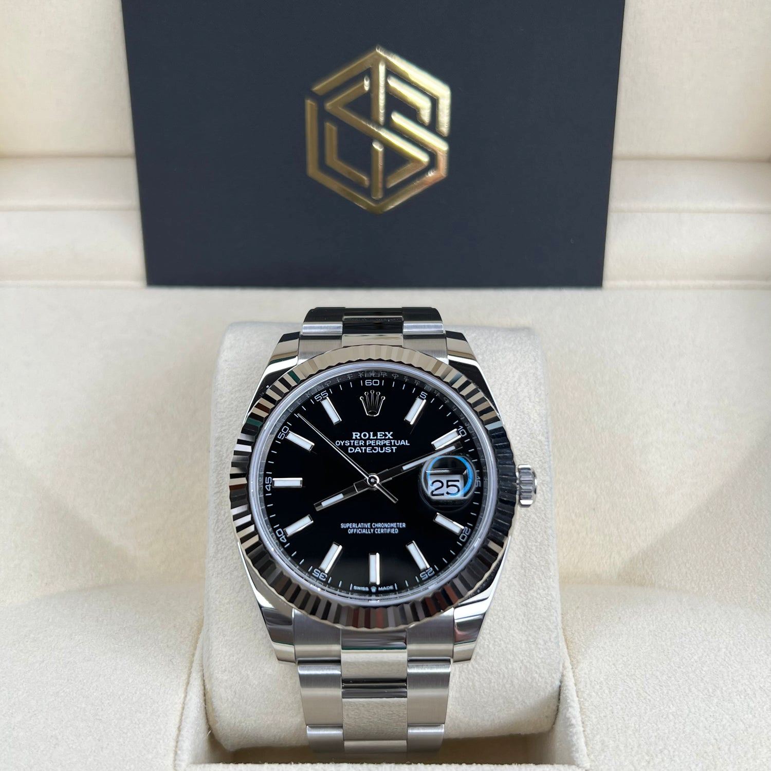 This latest model Datejust 41 features a crisp 18ct white gold fluted bezel and sports the incredibly popular blue baton dial. Fitted to the latest Jubilee bracelet with Oyster clasp, powered by Rolex's next generation automatci movement (cal.3235) and waterproof to 100m.