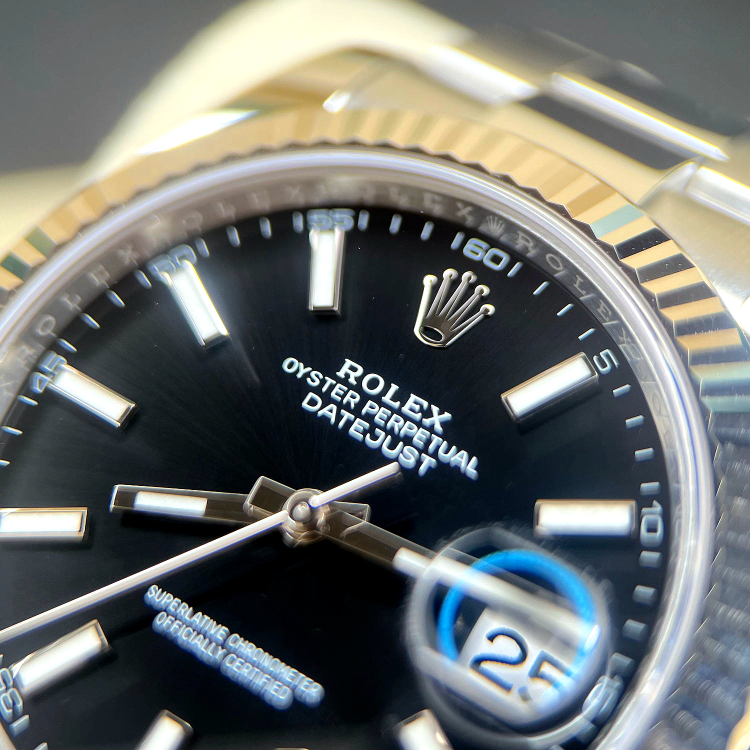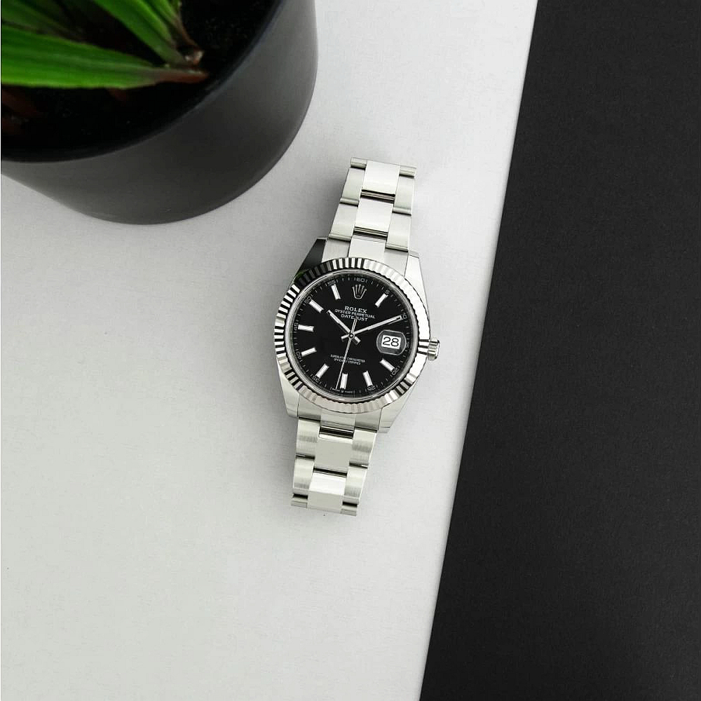 The light reflections on the case sides and lugs highlight the elegant profile of the 41 mm Oyster case, which is fitted with a fluted bezel. Aesthetically, the Datejust has spanned eras, while retaining the enduring codes that make it, notably in its traditional versions, one of the most recognized and recognizable of watches.