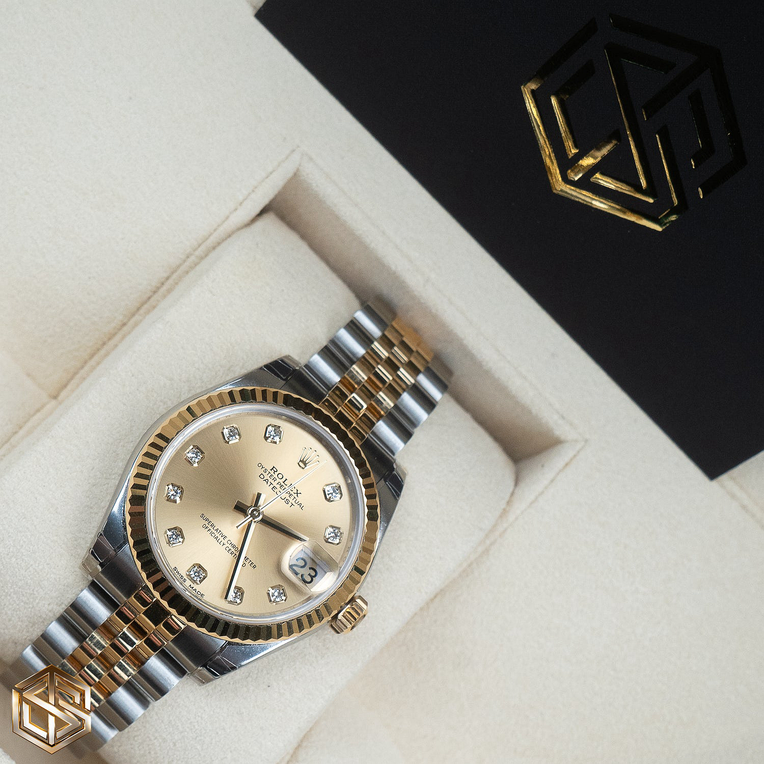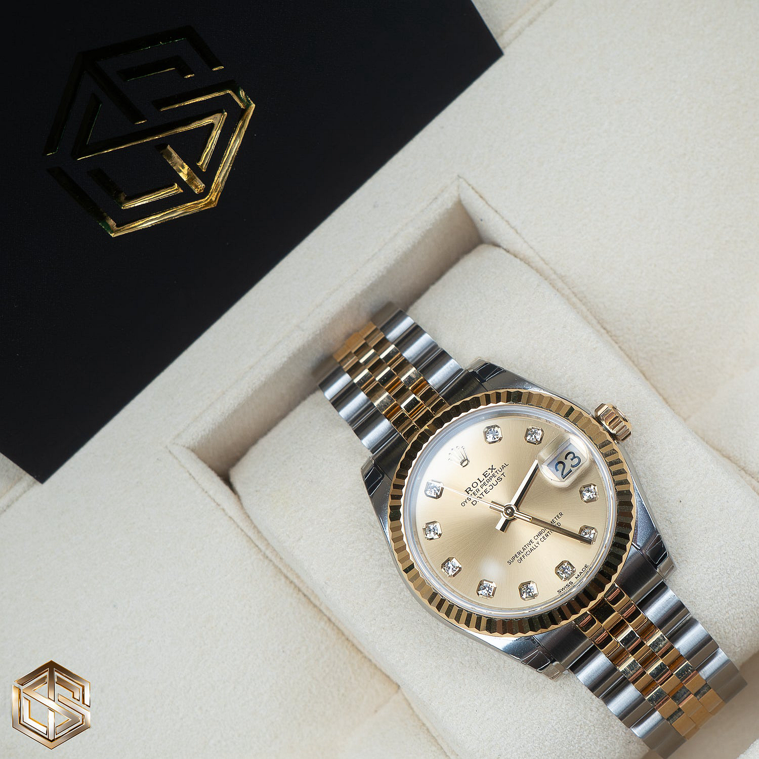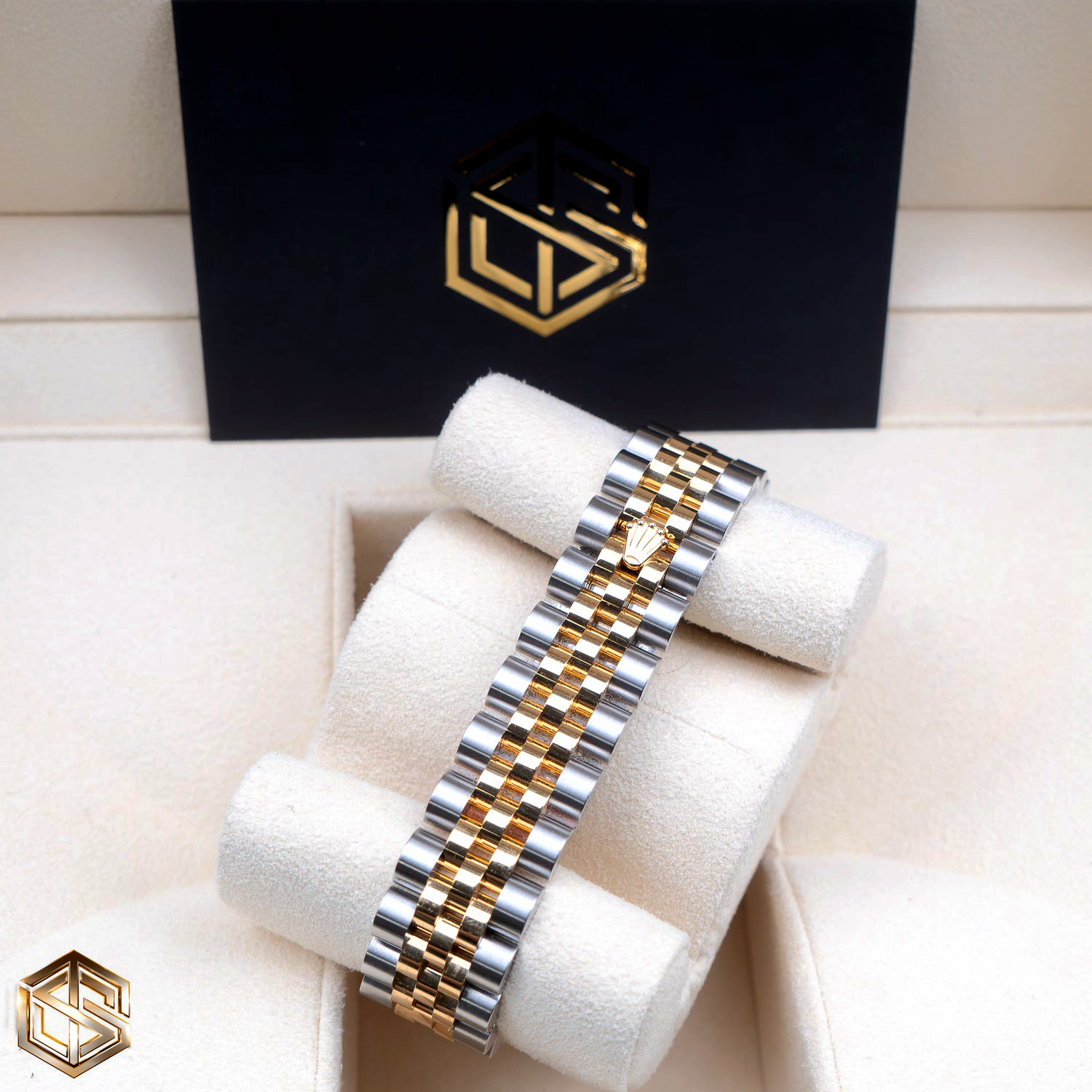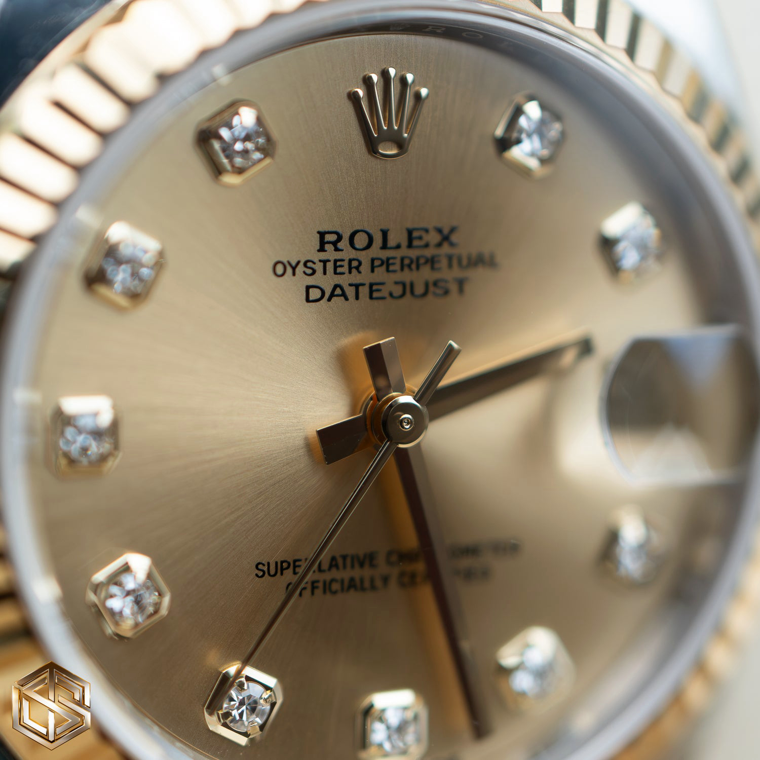 41mm Yellow Rolesor case with 904L steel monobloc middle case, screw-down steel back, 18K yellow gold screw-down crown, 18K yellow gold fluted bezel, scratch-resistant double anti-reflective sapphire crystal with cyclops lens over the date, champagne dial, index hour markers, Rolex caliber 3235 perpetual self-winding movement with date at 3 o'clock that changes instantaneously at midnight in a few thousandths of a second, approximately 70 hours of power reserve, yellow Rolesor Jubilee bracelet made from a combination of 904L steel and 18K yellow gold with five-piece links, folding Oysterclasp buckle with Easylink 5mm comfort extension link. Waterproof to 100 meters.