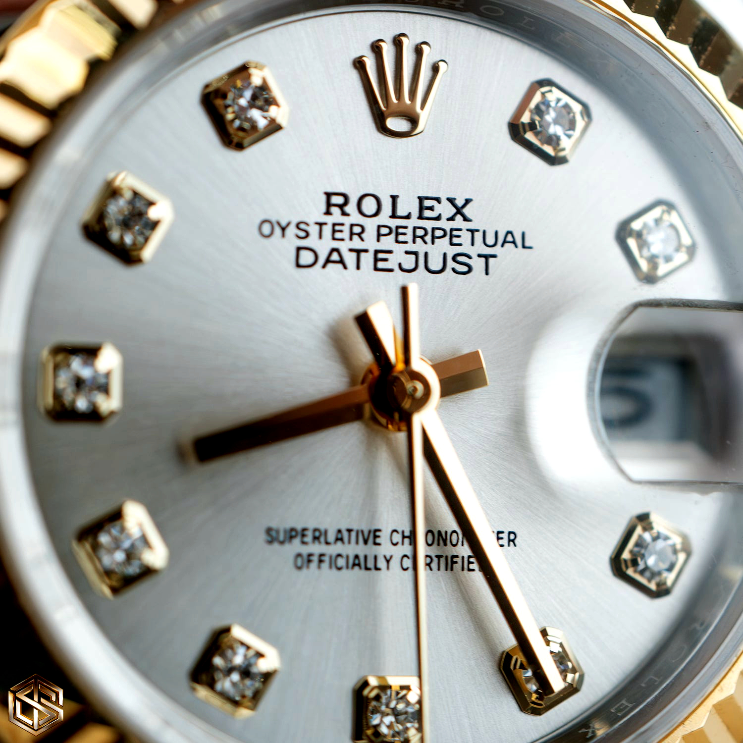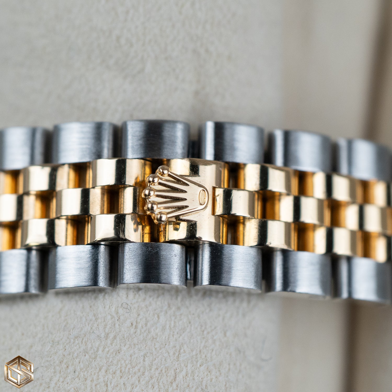 28mm Yellow Rolesor case with 904L steel monobloc middle case, screw-down steel back, 18K yellow gold screw-down crown, 18K yellow gold fluted bezel, scratch-resistant double anti-reflective sapphire crystal with cyclops lens over the date, champagne dial, index hour markers, Rolex caliber 3235 perpetual self-winding movement with date at 3 o'clock that changes instantaneously at midnight in a few thousandths of a second, approximately 70 hours of power reserve, yellow Rolesor Jubilee bracelet made from a combination of 904L steel and 18K yellow gold with five-piece links, folding Oysterclasp buckle with Easylink 5mm comfort extension link. Waterproof to 100 meters.