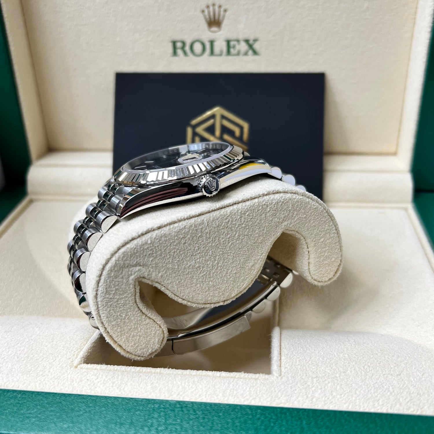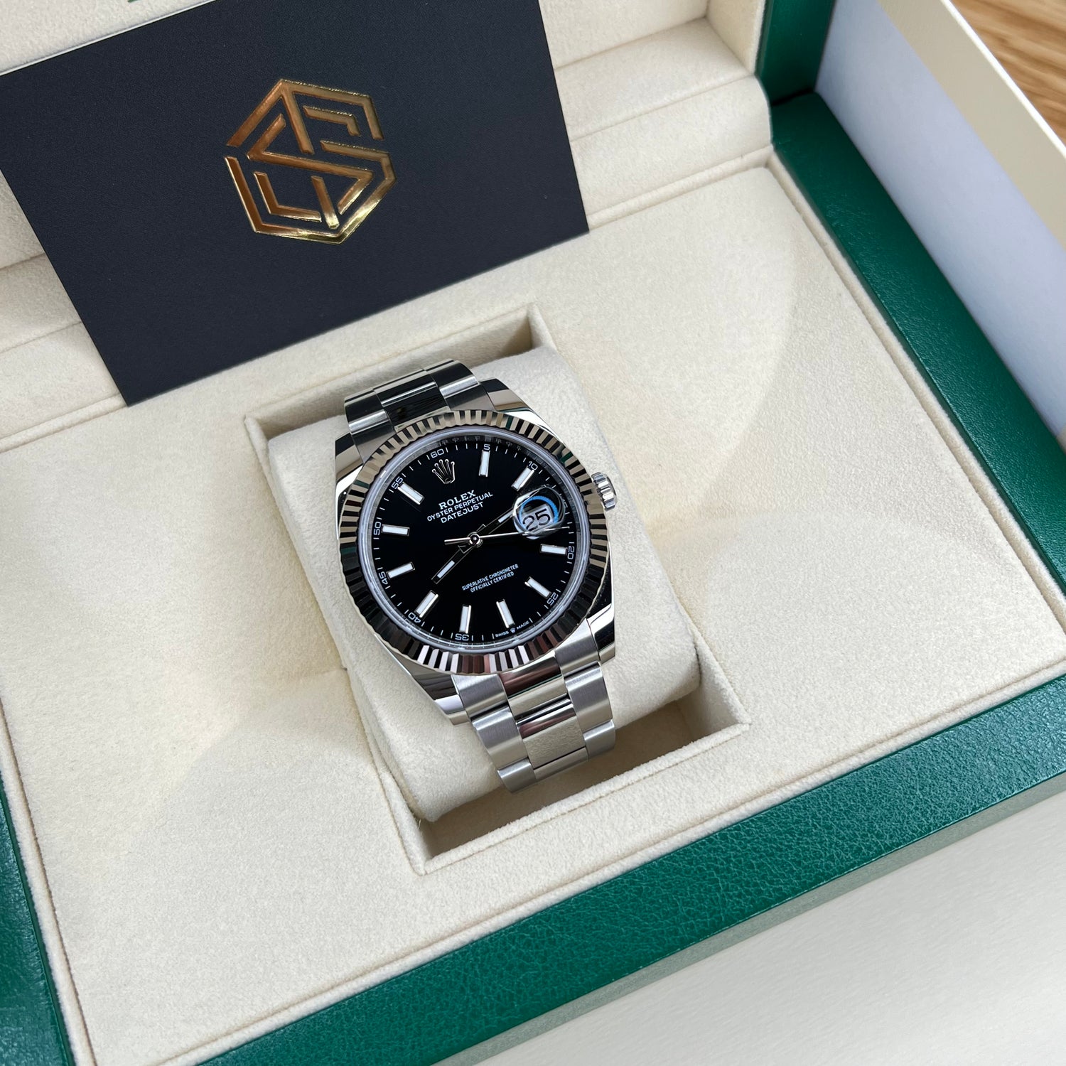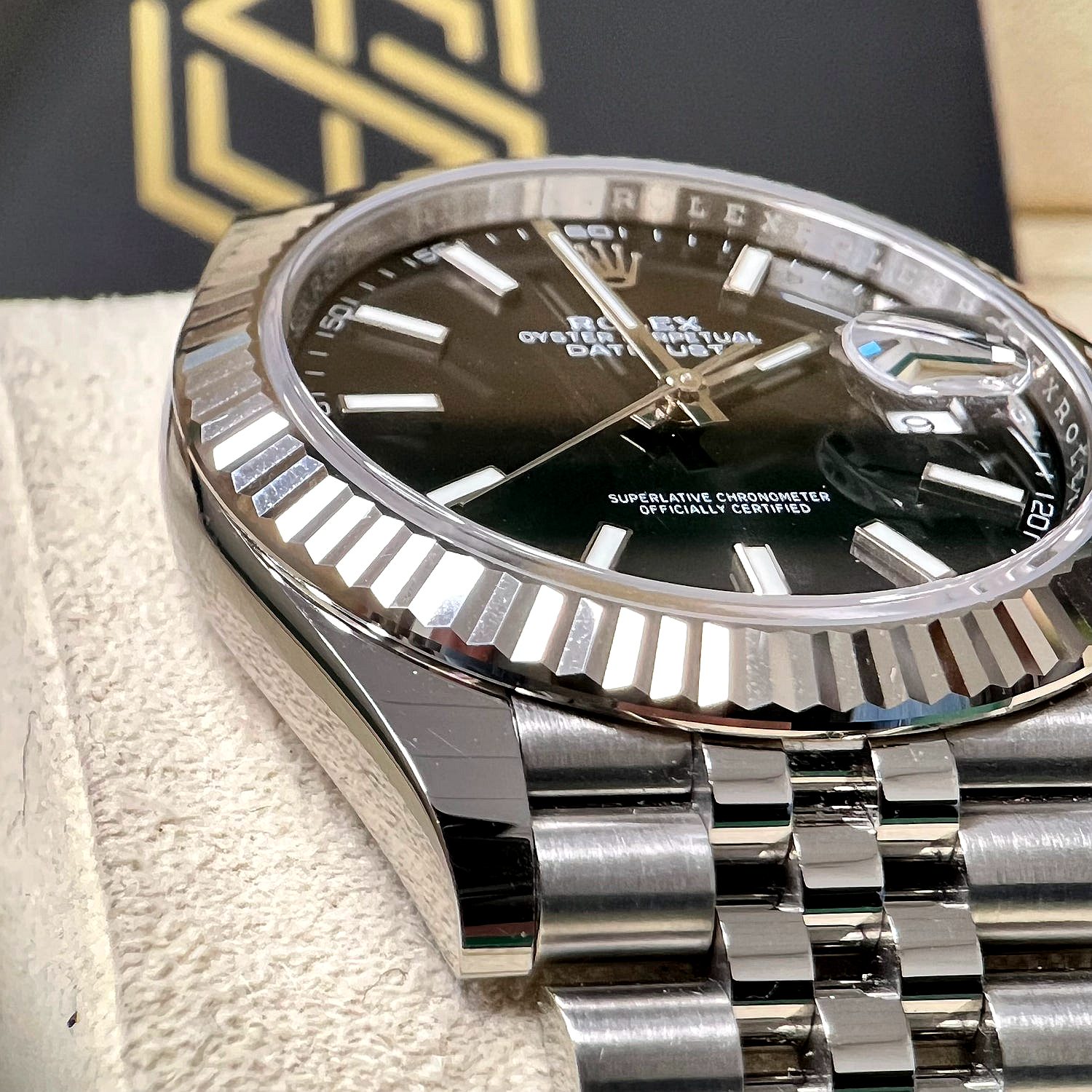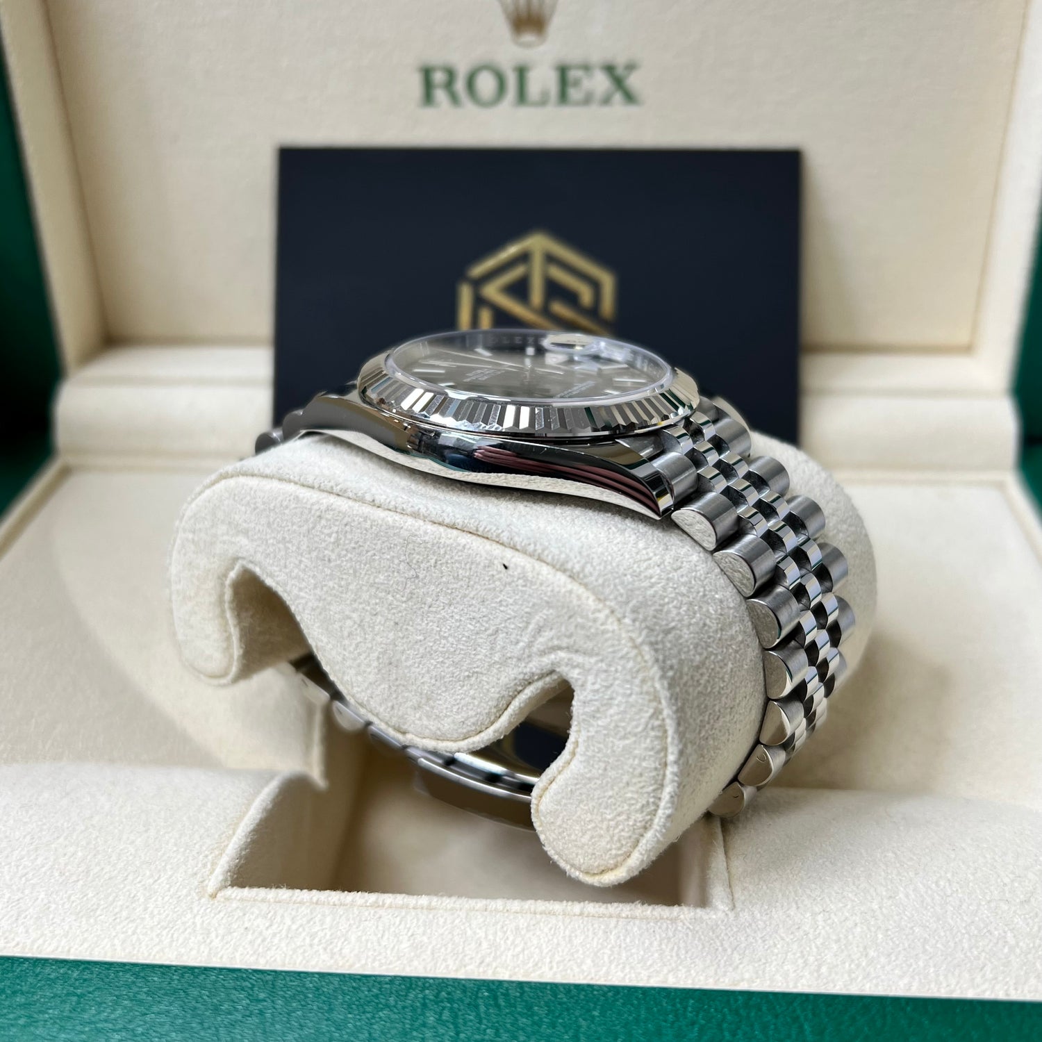 This latest model Datejust 41 features a crisp 18ct white gold fluted bezel and sports the incredibly popular blue baton dial. Fitted to the latest Jubilee bracelet with Oyster clasp, powered by Rolex's next generation automatci movement (cal.3235) and waterproof to 100m.