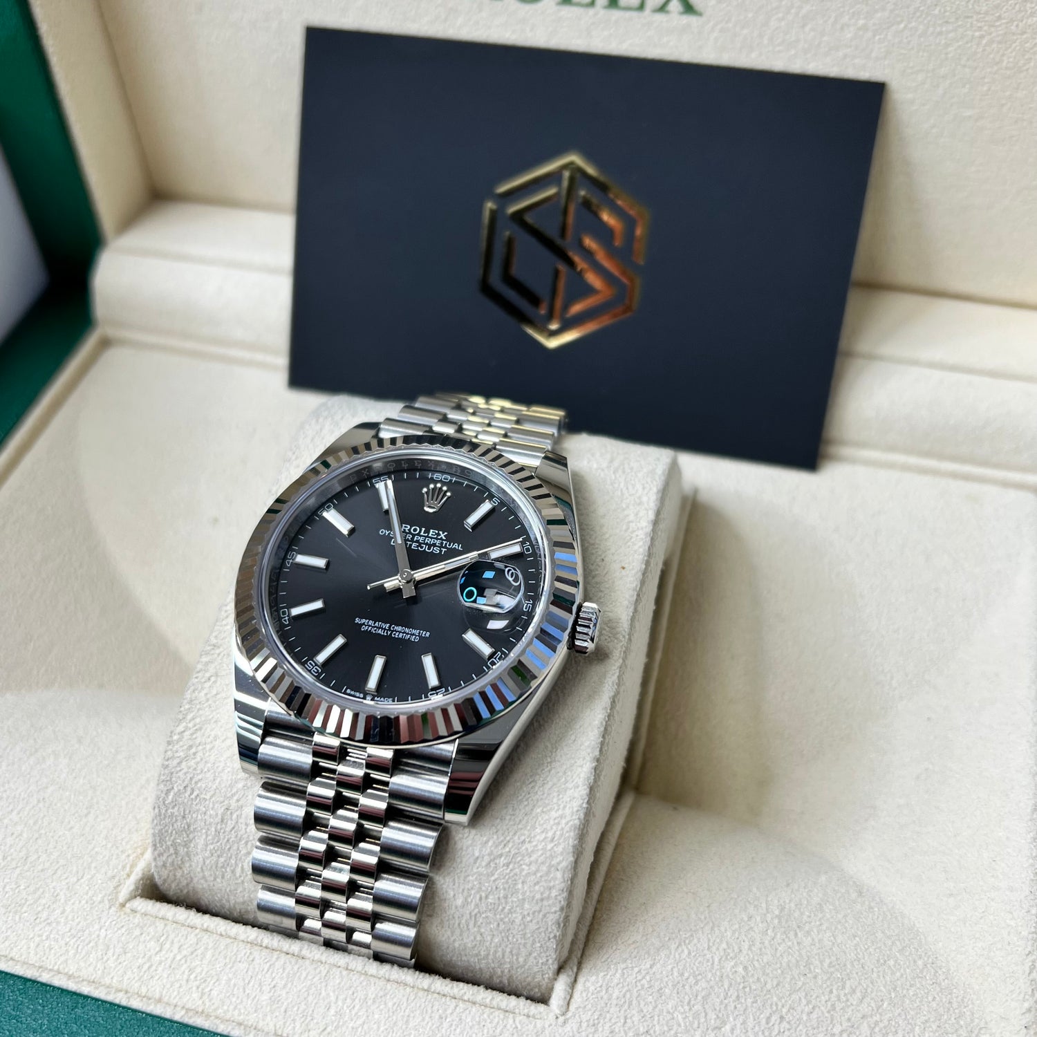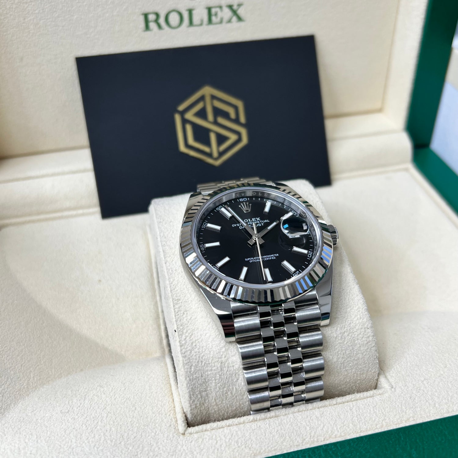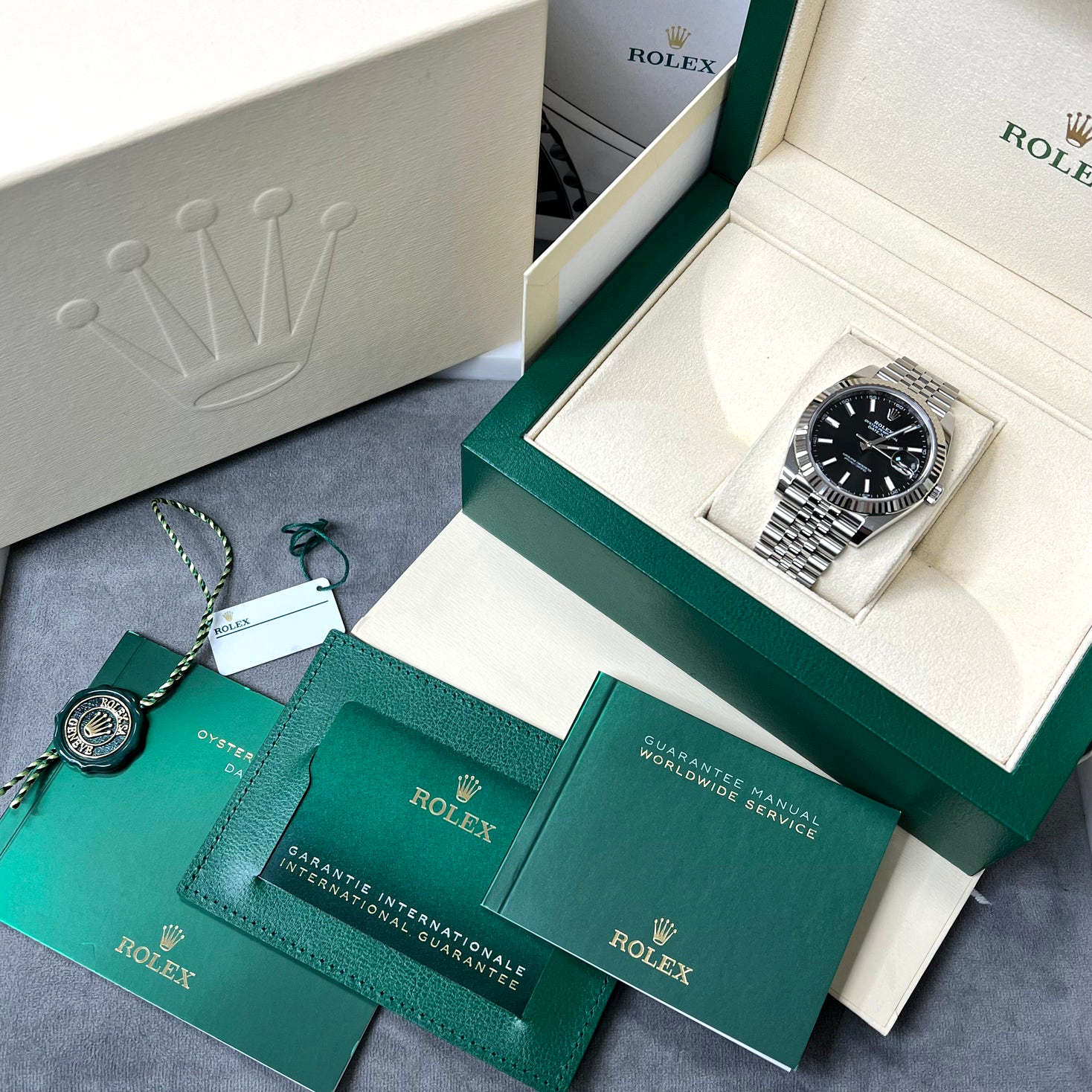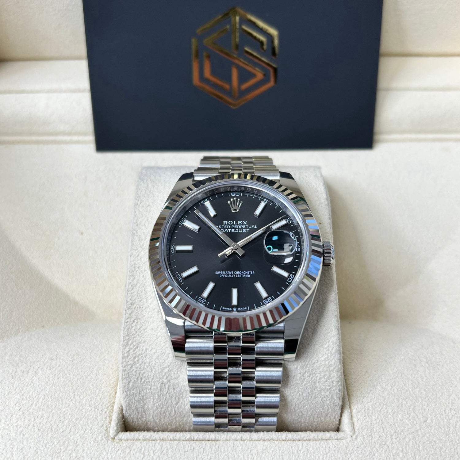 This latest model Datejust 41 features a crisp 18ct white gold fluted bezel and sports the incredibly popular blue baton dial. Fitted to the latest Jubilee bracelet with Oyster clasp, powered by Rolex's next generation automatci movement (cal.3235) and waterproof to 100m.