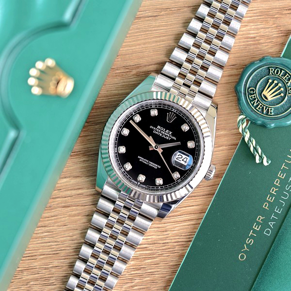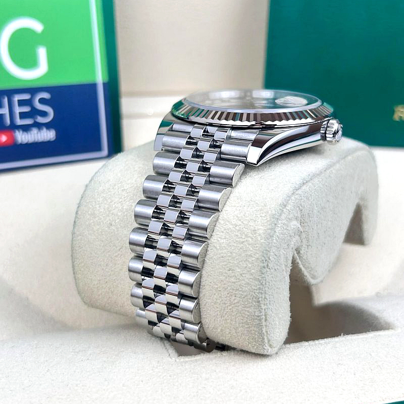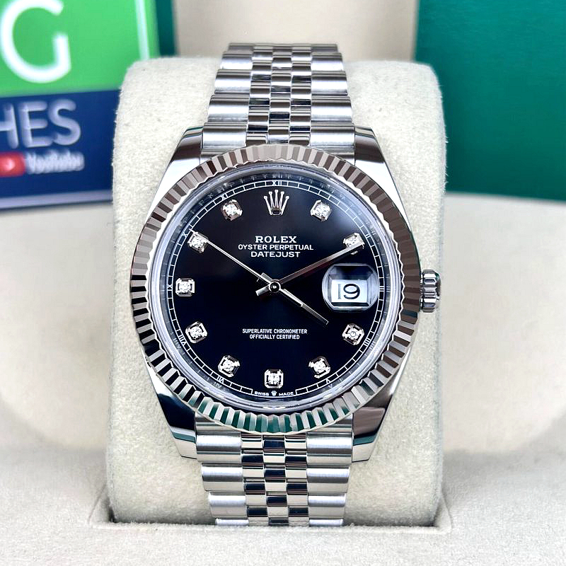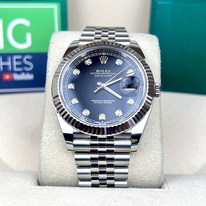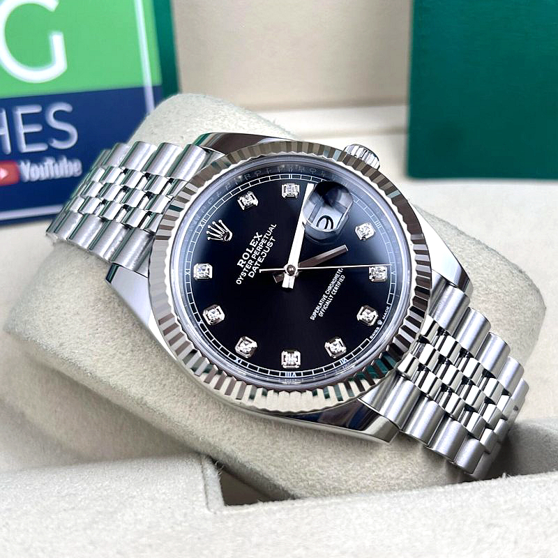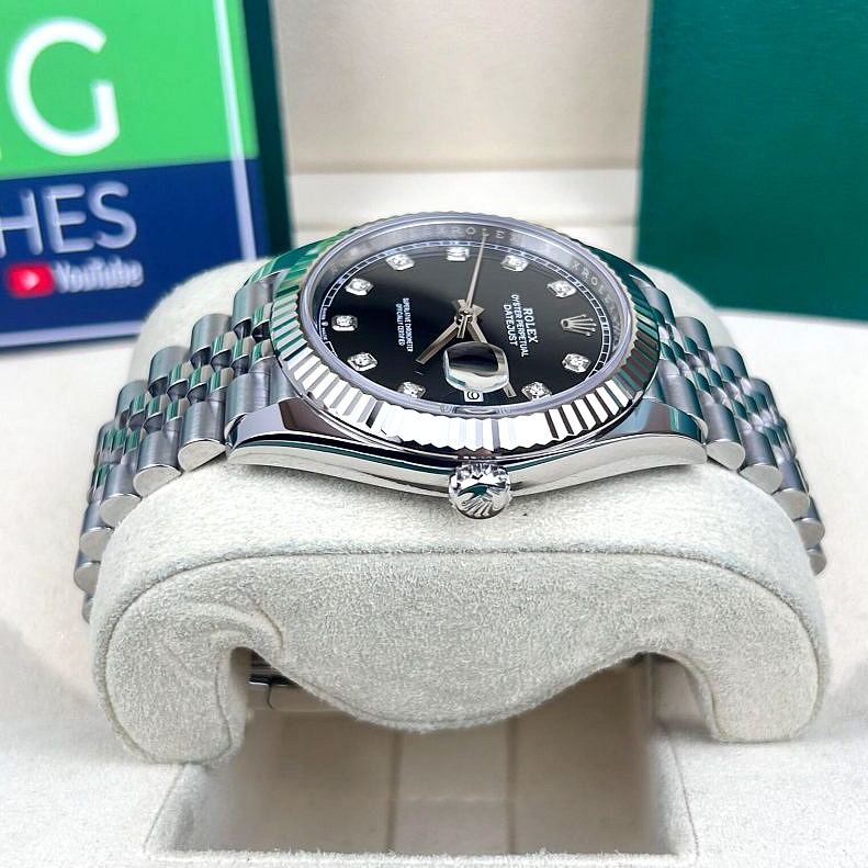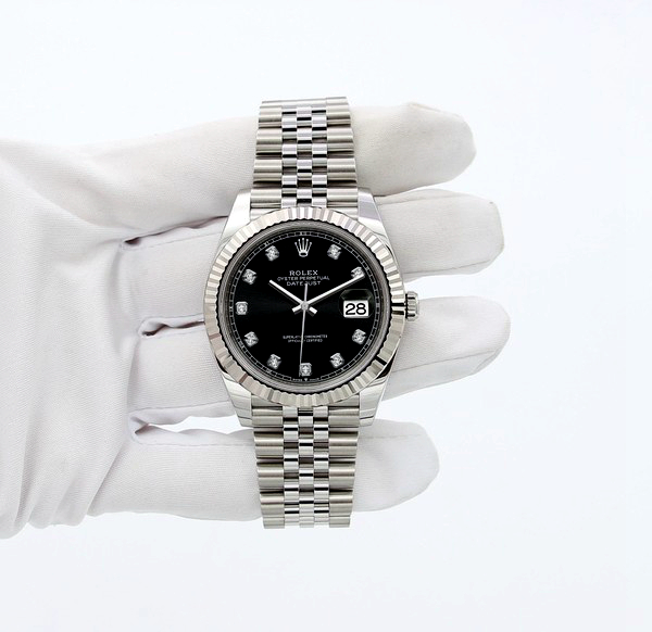41mm white Rolesor case comprised of a 904L steel monobloc middle case, screw-down steel back, screw-down crown with twin lock double waterproofness system, 18K white gold fluted bezel, scratch-resistant double anti-reflective sapphire crystal with cyclops lens over the date, dark rhodium dial, 10 diamond hour markers, Rolex calibre 3235 perpetual self-winding movement with date at 3 o'clock that changes instantaneously at midnight in a few thousandths of a second, approximately 70 hours of power reserve, 904L steel Oyster bracelet with three-piece links, folding Oysterclasp buckle with Easylink 5mm comfort extension link. Waterproof to 100 meters.